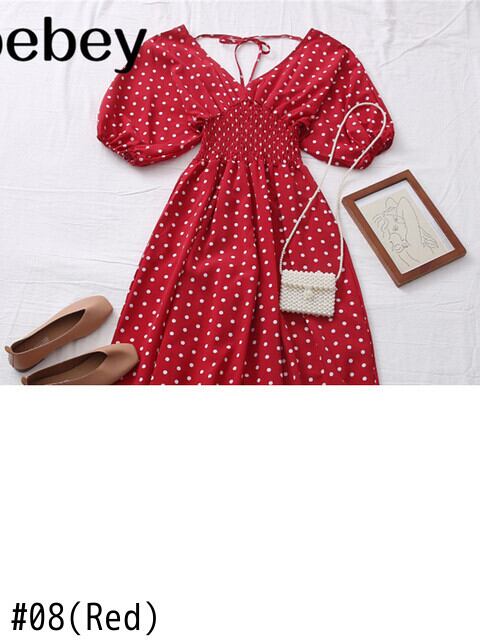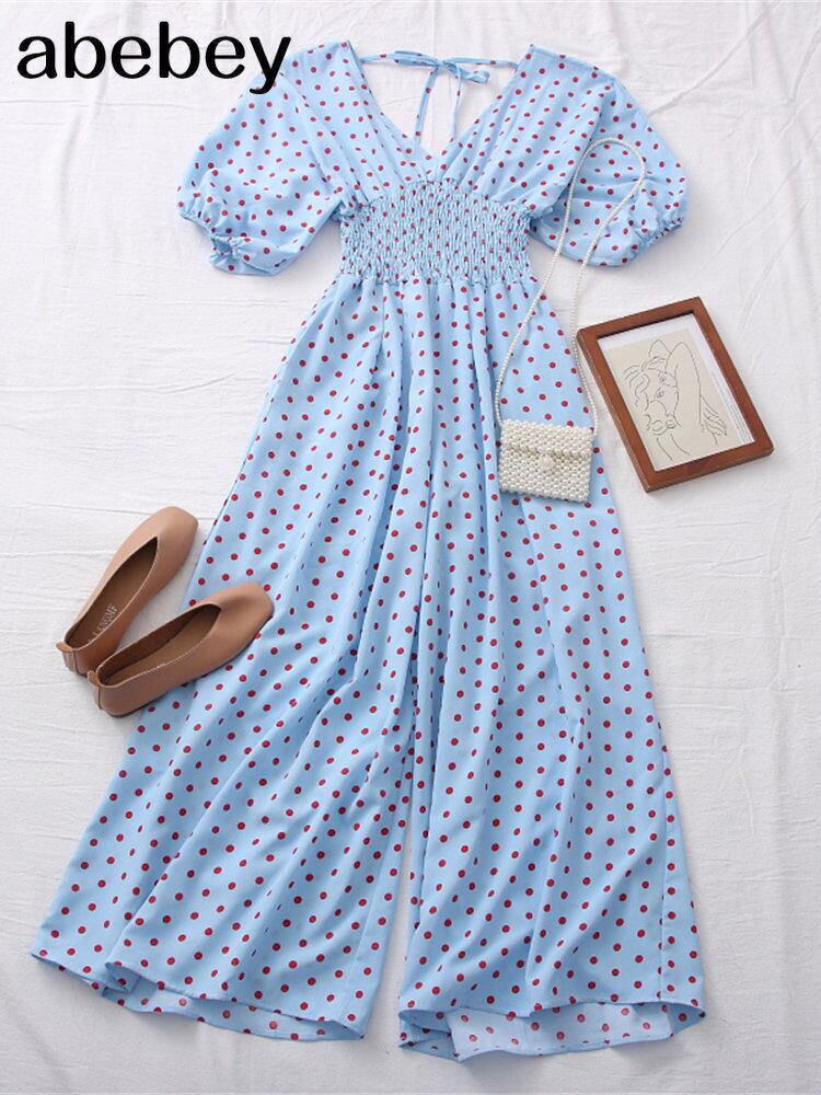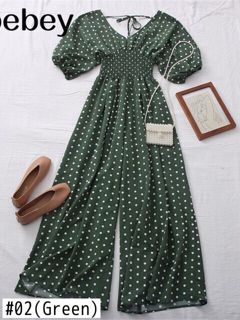 春夏ドット V ネックジャンプスーツオープンバックストラップジャンプスーツハイウエストスリムパフスリーブカジュアルジャンプスーツ ハイウェスト スプリング 春物 サマー 夏物 Vネック Abe61776508484