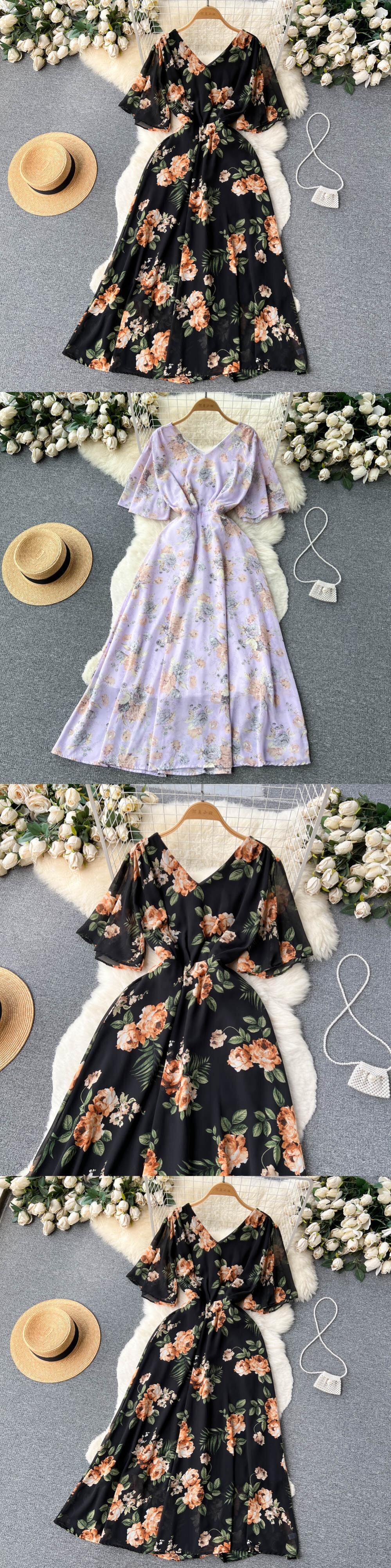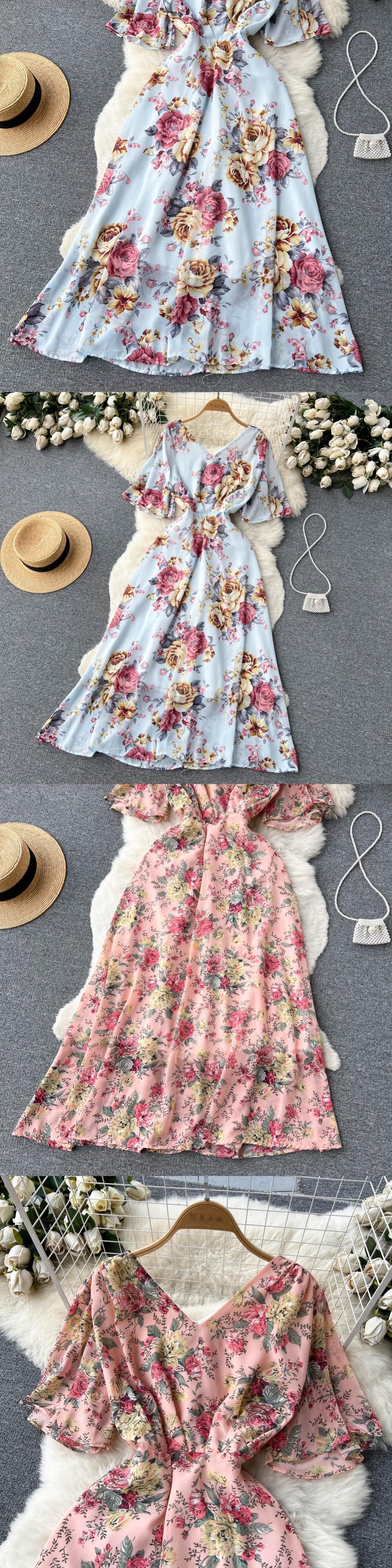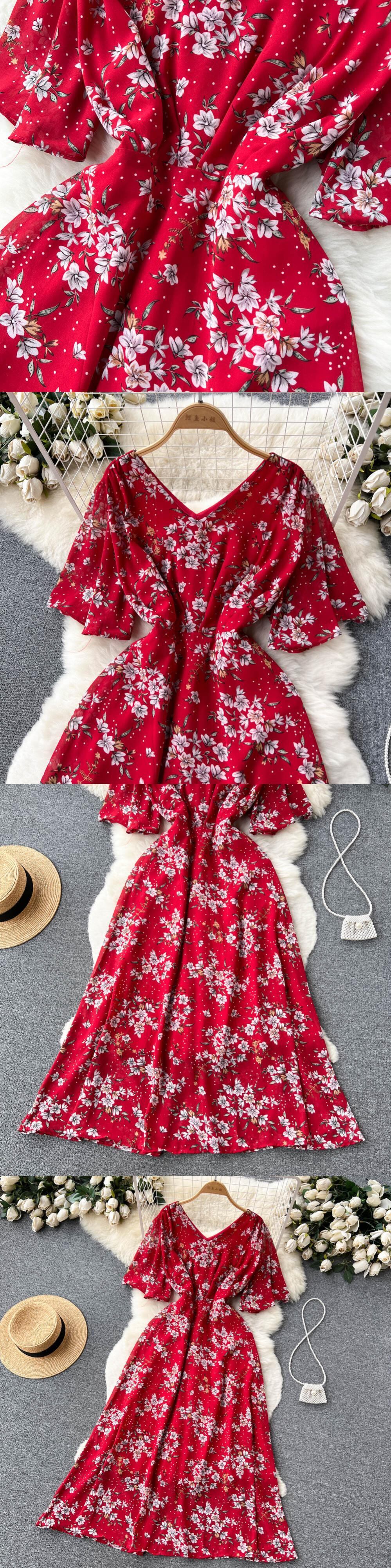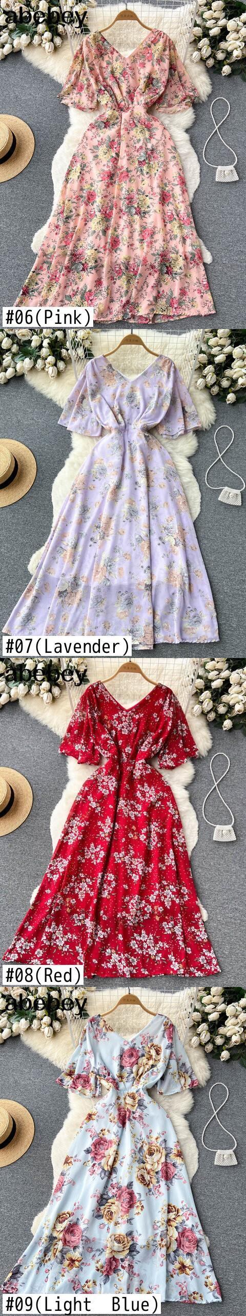 夏の V ネック フリル女性ドレス ベルト ラップ プリント ミディ ドレス セクシーな A ライン ドレス ビーチ サンドレス スウィート ミディ ドレス 大人ガーリー キュート カジュアル サマー 夏物 ハーネス Vネック Aライン Abe36123319480