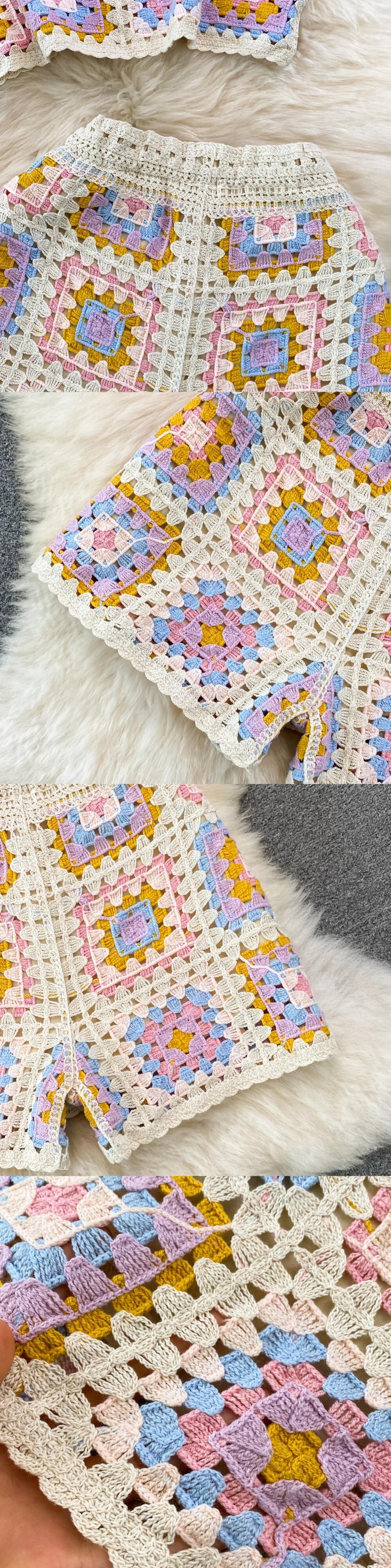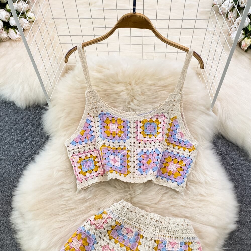 海辺の休日のスーツの女性の夏の摩耗のレトロなかぎ針編み中空ニット サスペンダー トップ + ショーツ 2 点セット サマー 夏物 ブルマー Abe45884533435