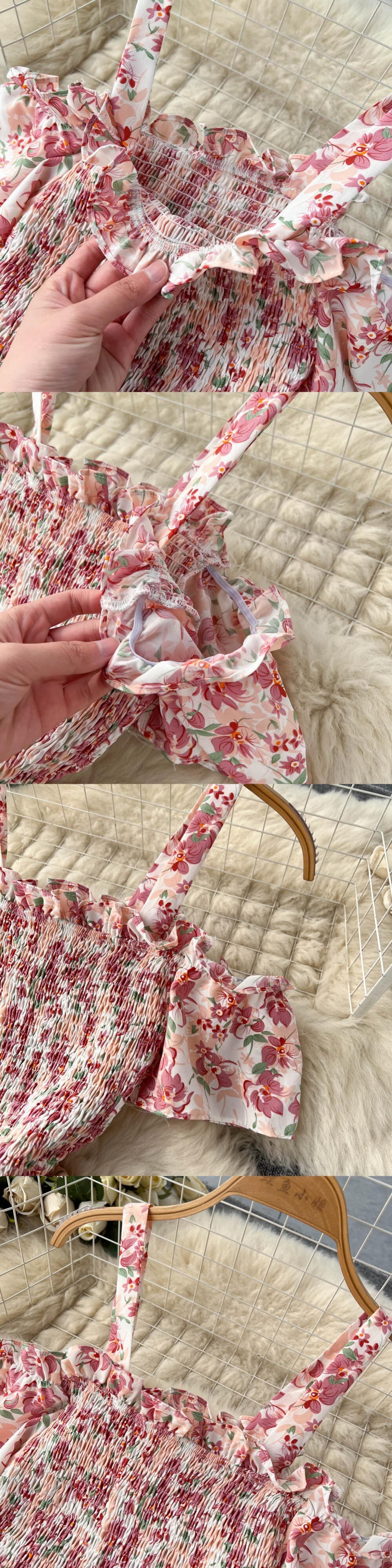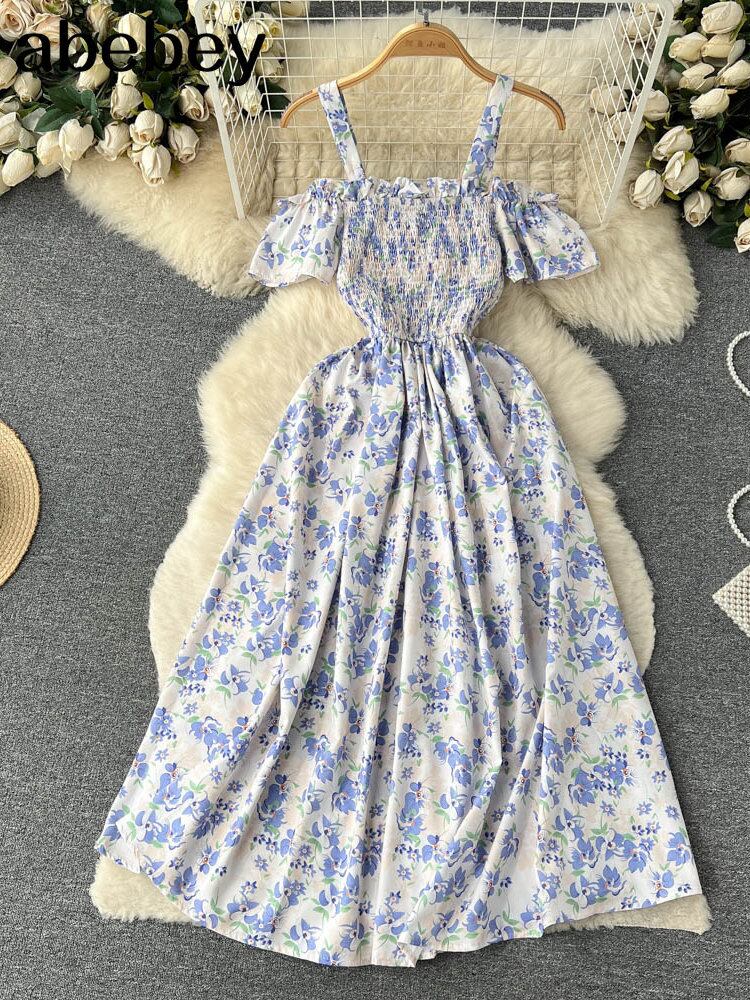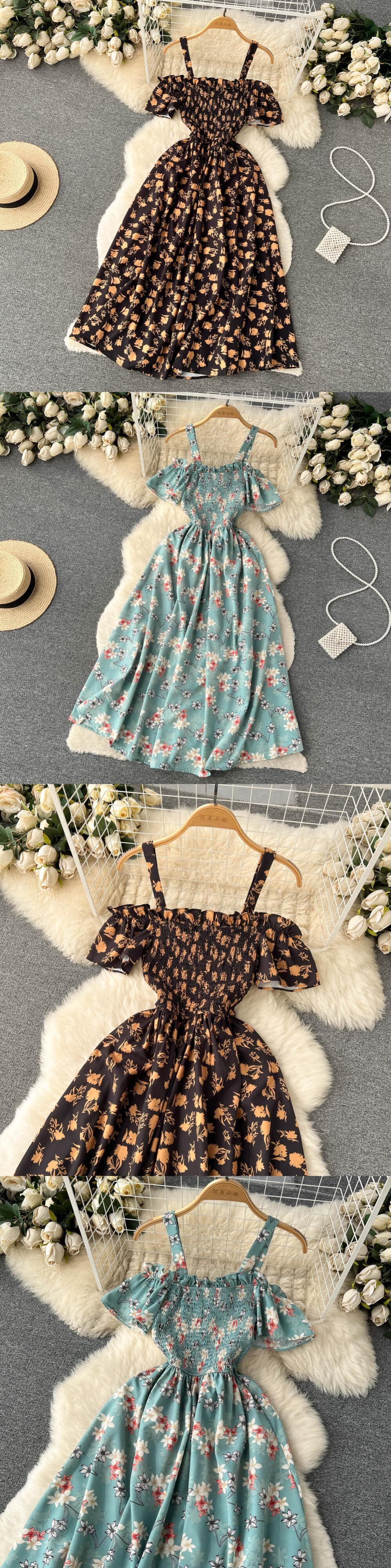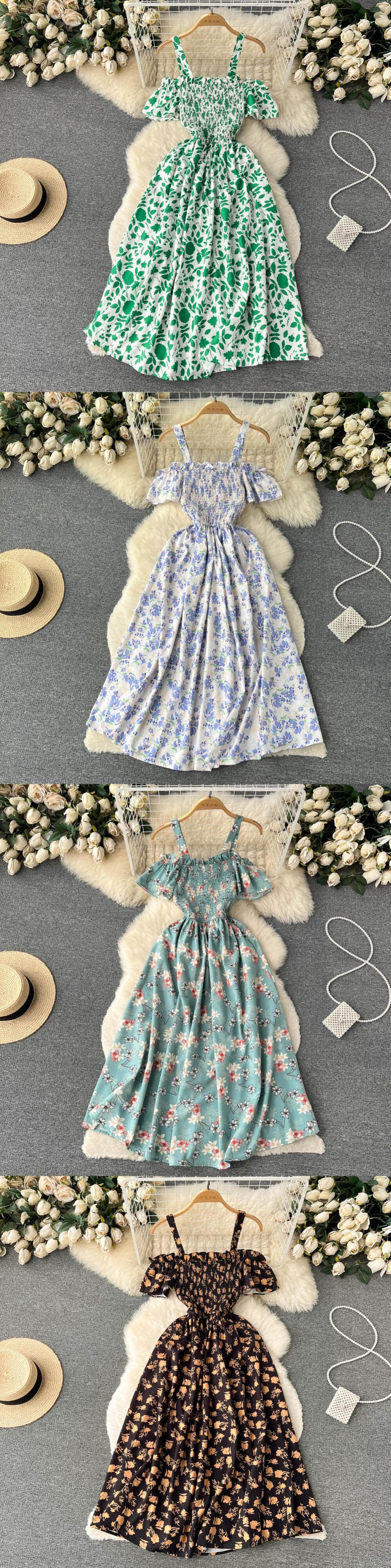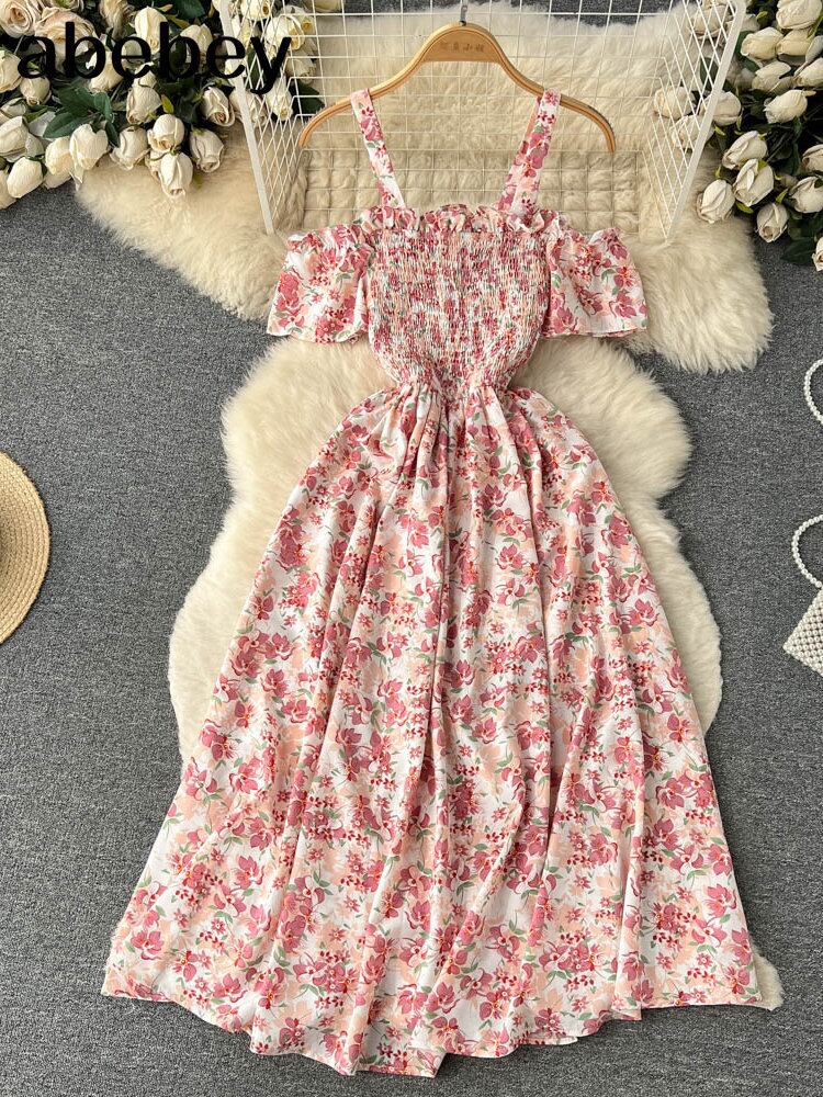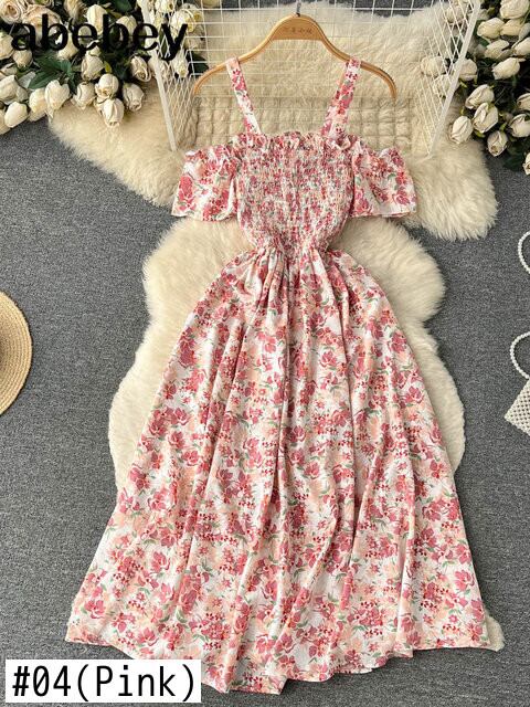 シフォン花柄キャミソールサンドレス女性優しいオフショルダー半袖ひだ弾性スリムビーチロングドレス ショート ハーフスリーブ エラスティック 伸縮 Abe56679270500