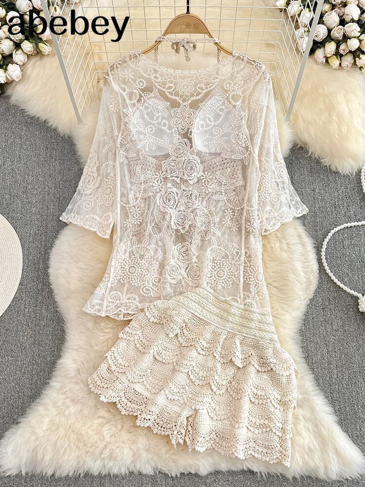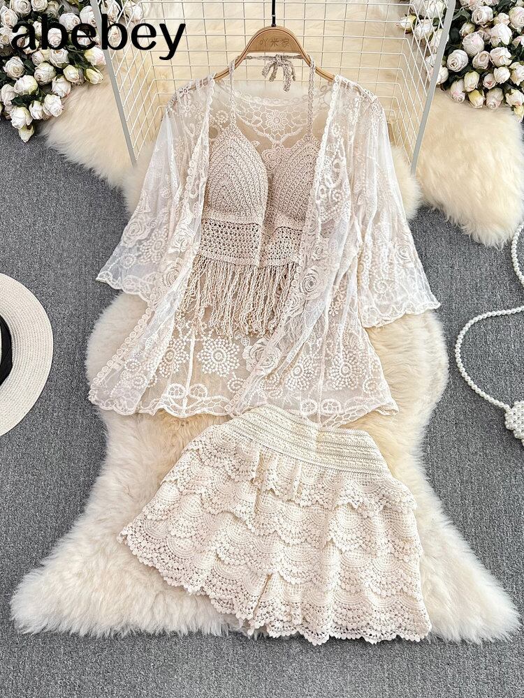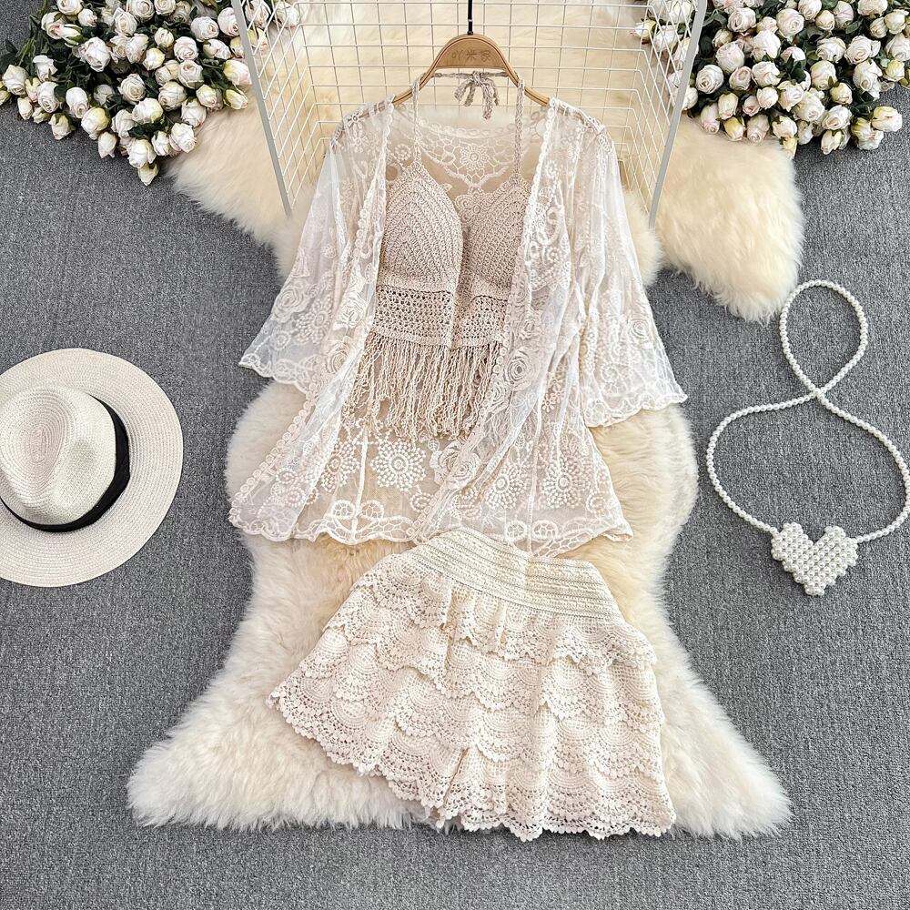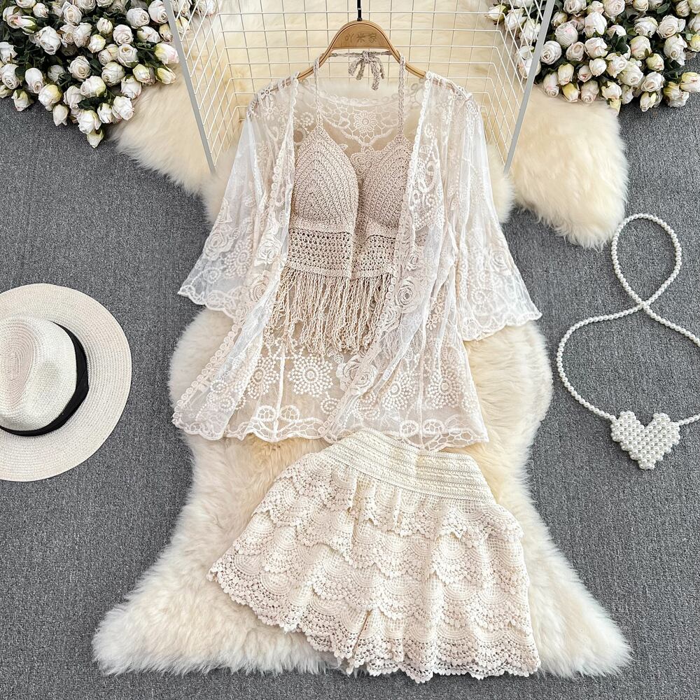女性の夏のビーチスタイルかぎ針編み中空アウト 3 点セット太陽プルーフトップス + エスニックスパゲッティストラップベスト + ショーツ休暇スーツ サマー 夏物 ブルマー Abe64948061871