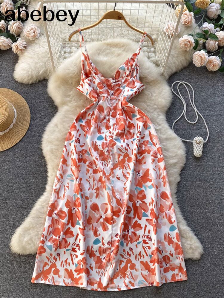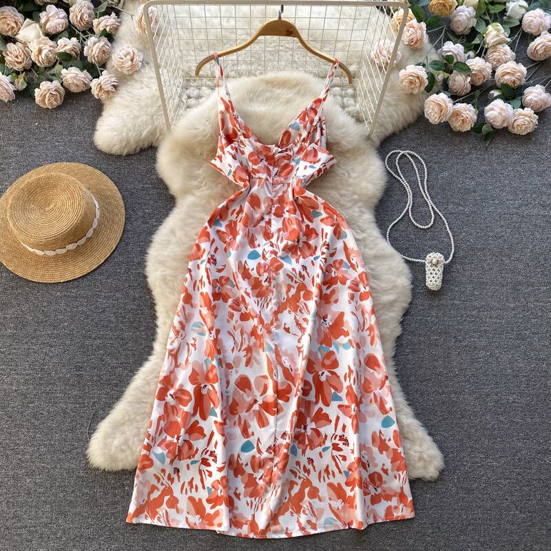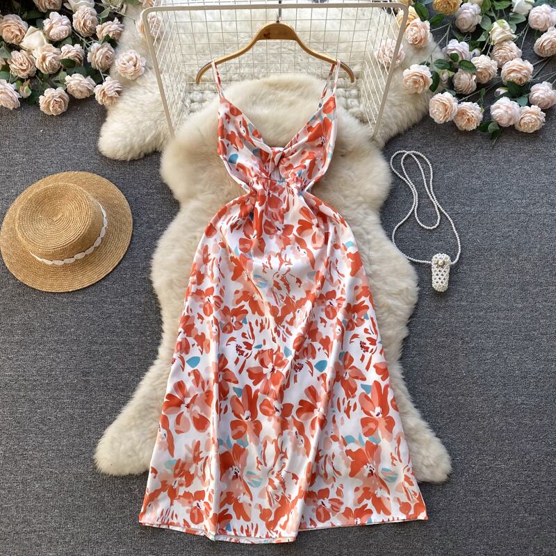 タイダイ サマー プリント ドレス スパゲッティ ストラップ シフォン フローラル スリム ビーチ ロング サンドレス スプリット パーティー セクシー ミディ ドレス 夏物 花柄 Abe80729825181