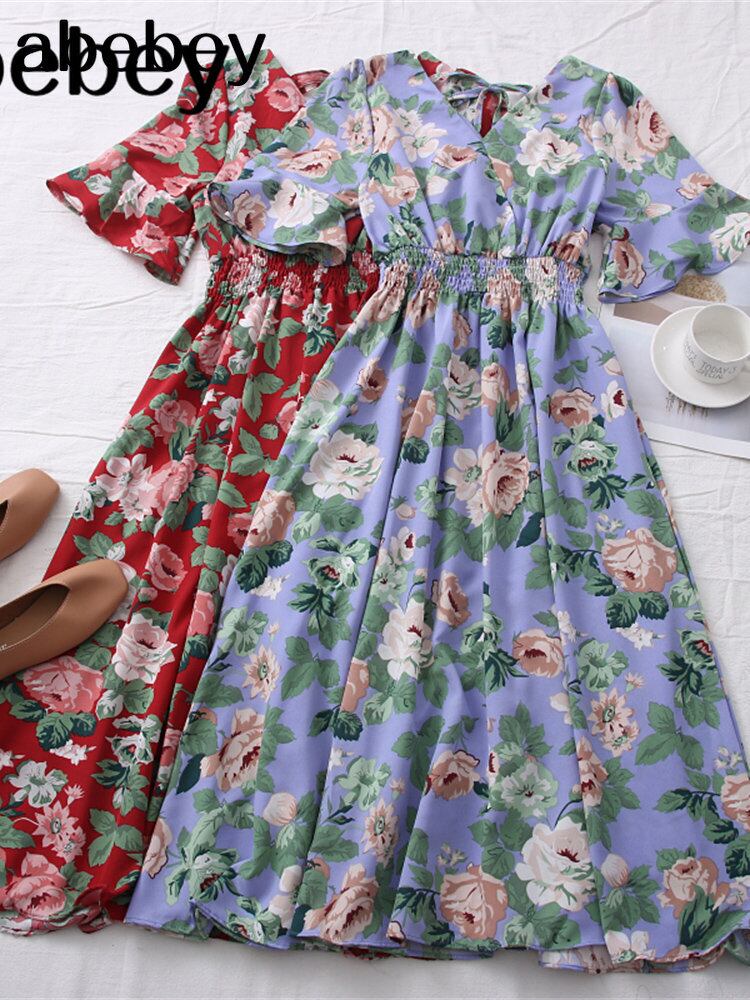 女性フレンチフローラルドレスサマースウィートフリルノースリーブAラインドレスボヘミアンプリントホリデービーチミディロングドレス ラッフル 大人ガーリー キュート カジュアル 夏物 花柄 Abe53715273496