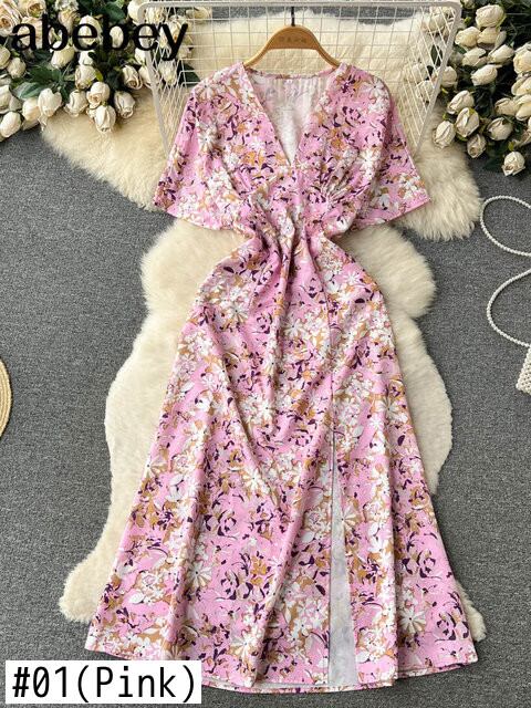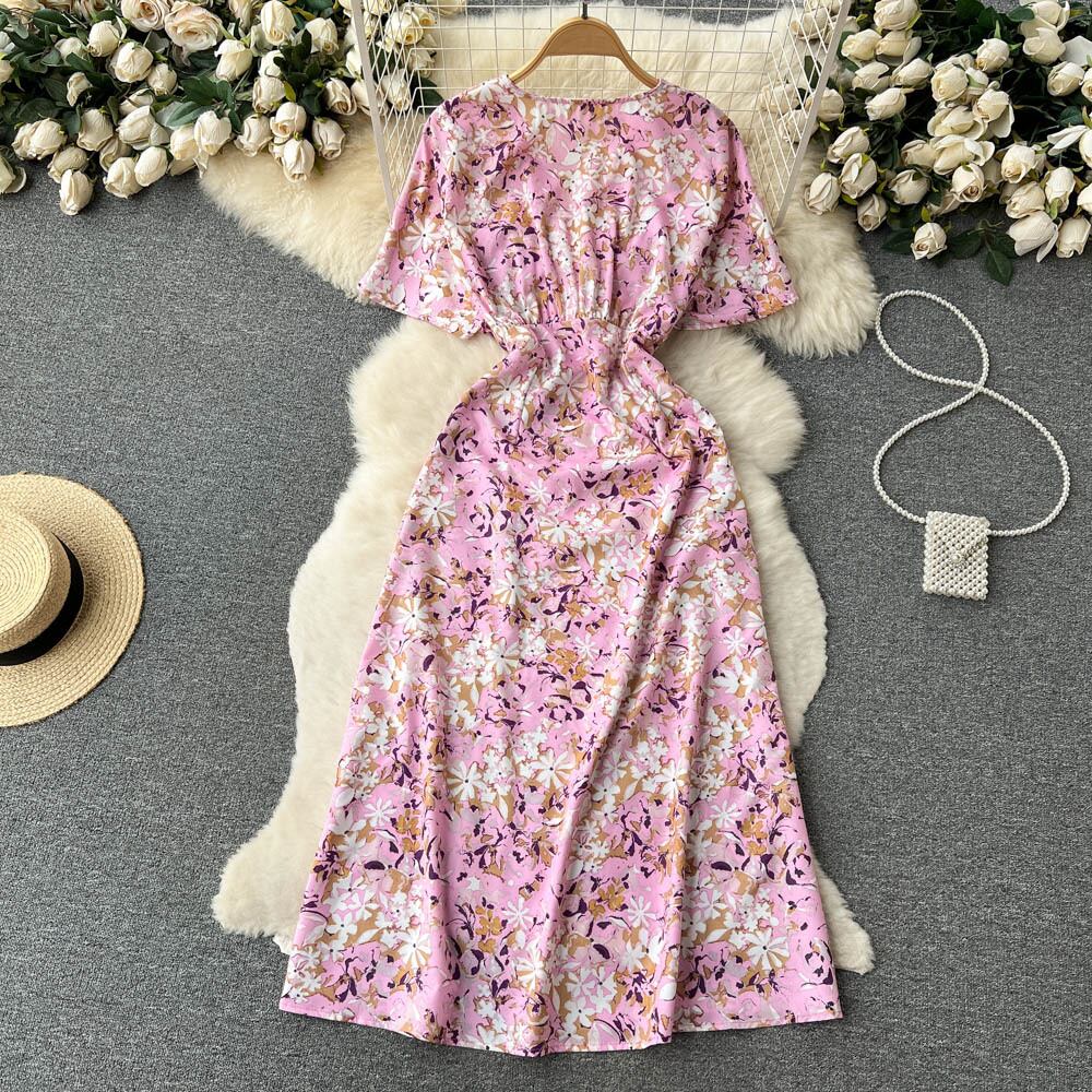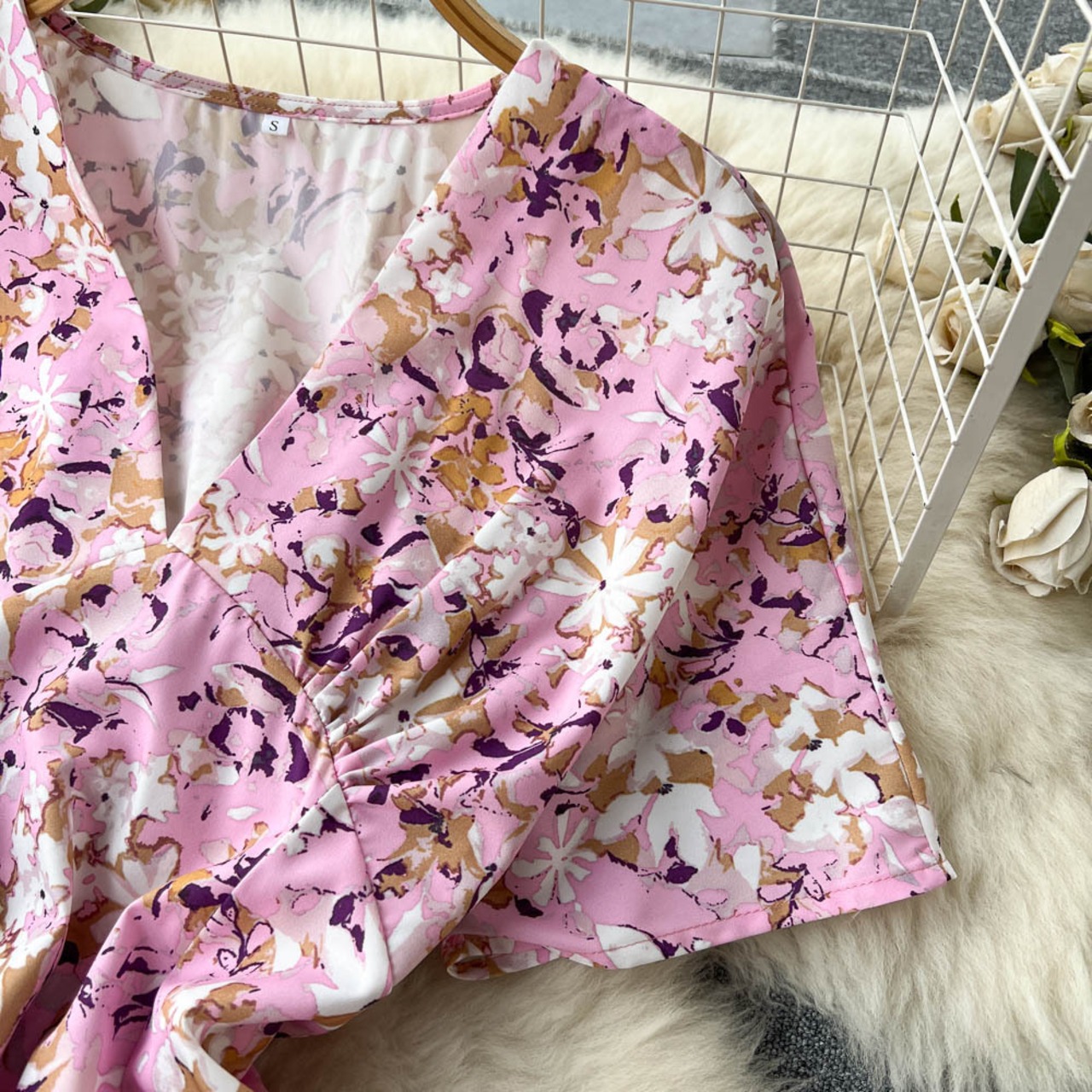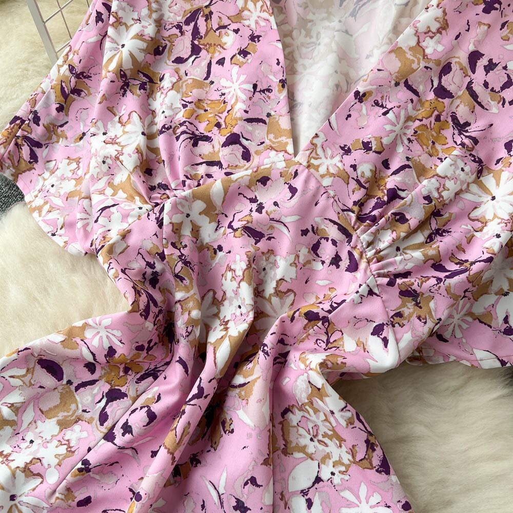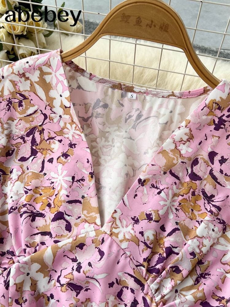 レトロ花柄ドレス女性フレアスリーブスプライシングフリルミニドレス V ネックルーズボヘミアンビーチドレス ラッフル Vネック Abe46487820895