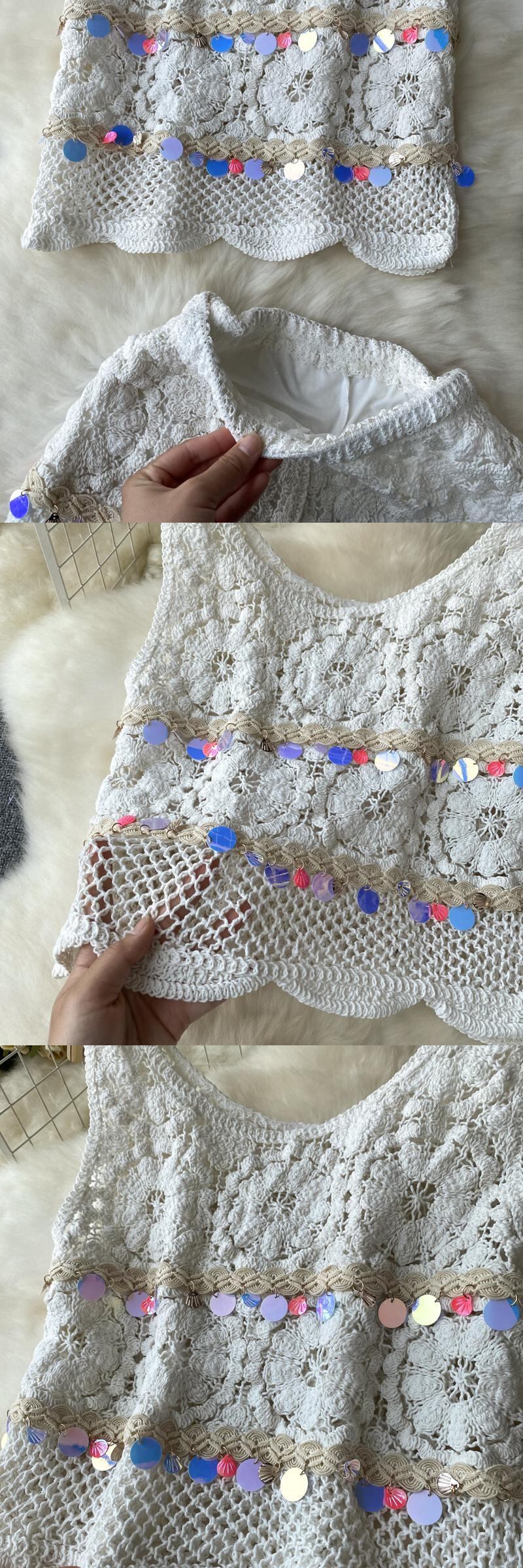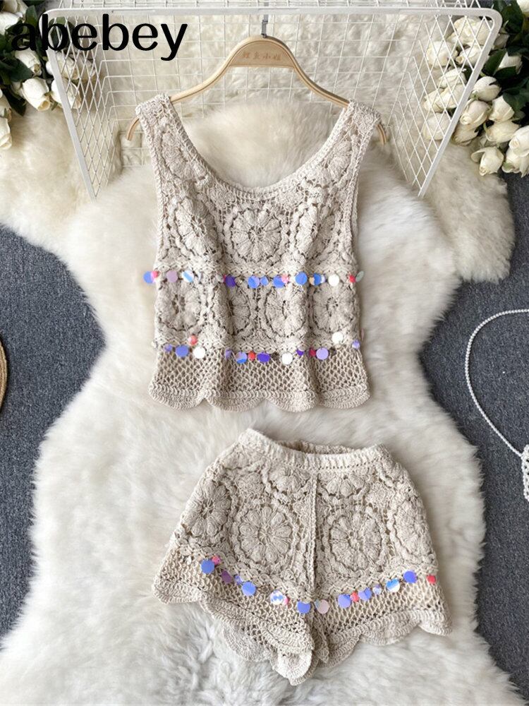 中空アウトニットセット女性ノースリーブタンクトップ + ワイドレッグショーツセットスパンコールビーチツーピーススーツ ブルマー ワイドパンツ Abe70124667286