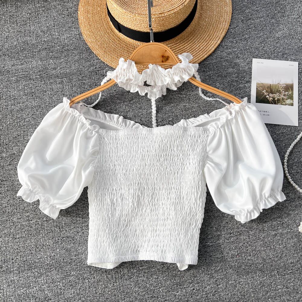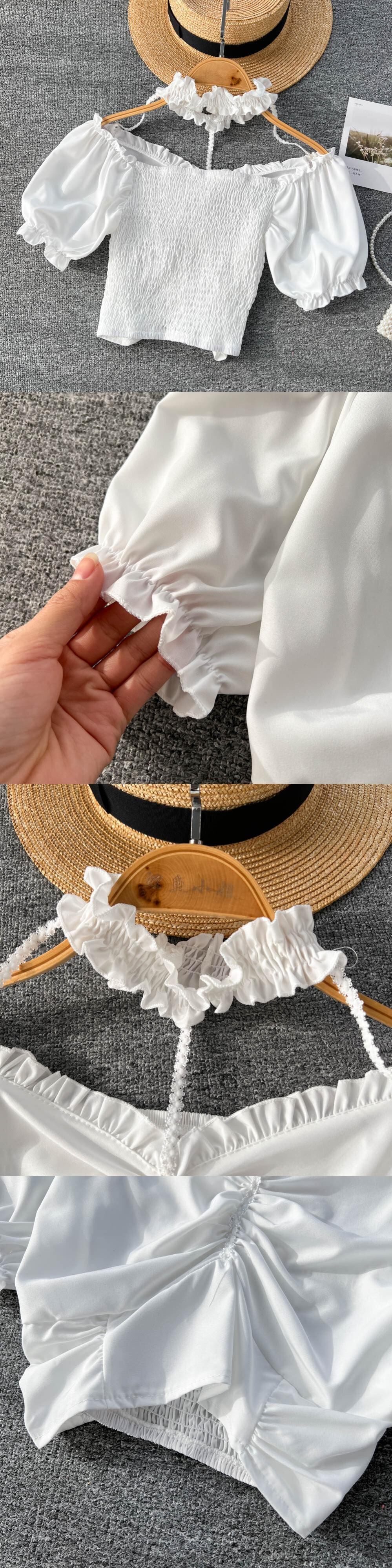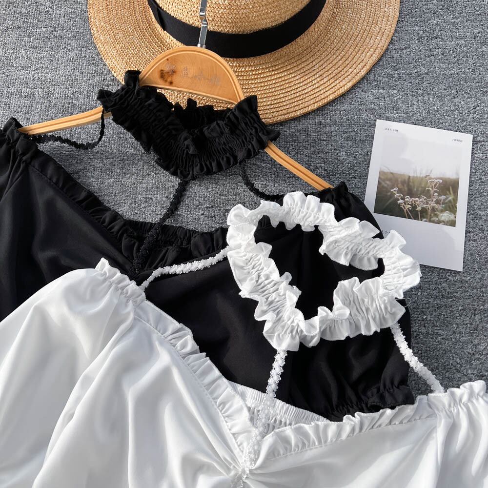 女性ソリッドホルターショートシャツロングフレアスリーブブラウス中空アウト秋フレンチスリムクロップトップス オータム 秋物 ソリッドカラー Abe67490503224