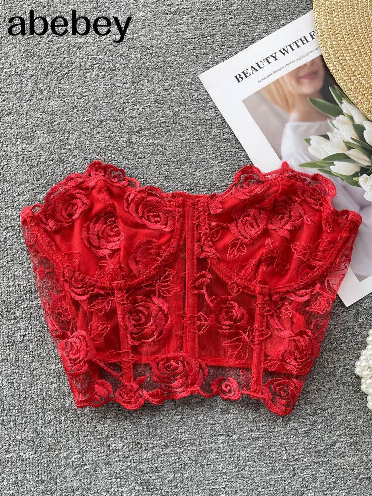 夏のレース刺繍セクシーなタンクトップ下着背中の開いた透視女性ストラップレスミニタンクトップ サマー 夏物 Abe80437985470