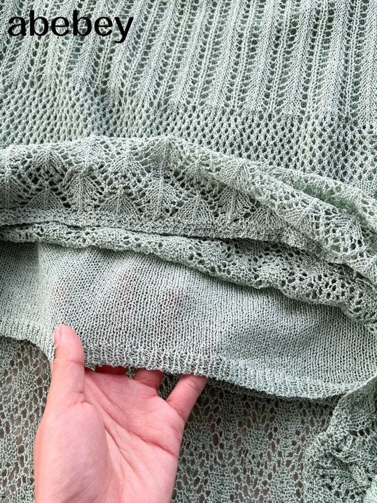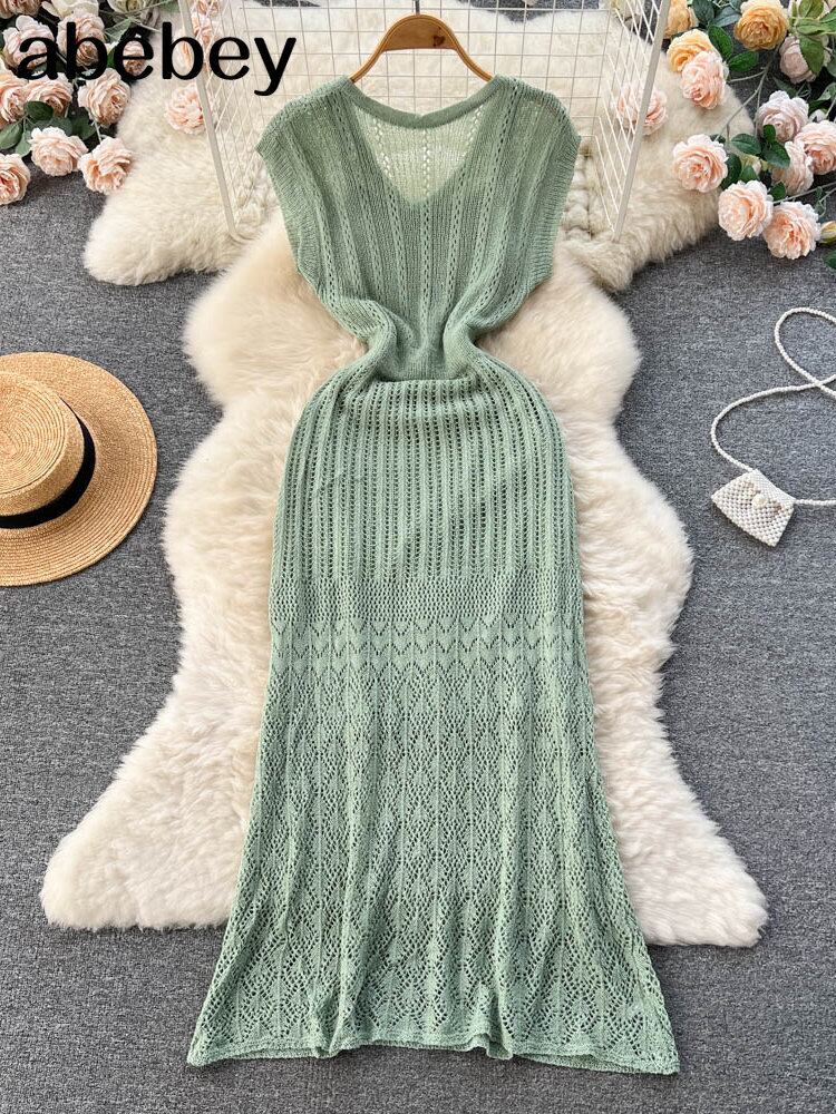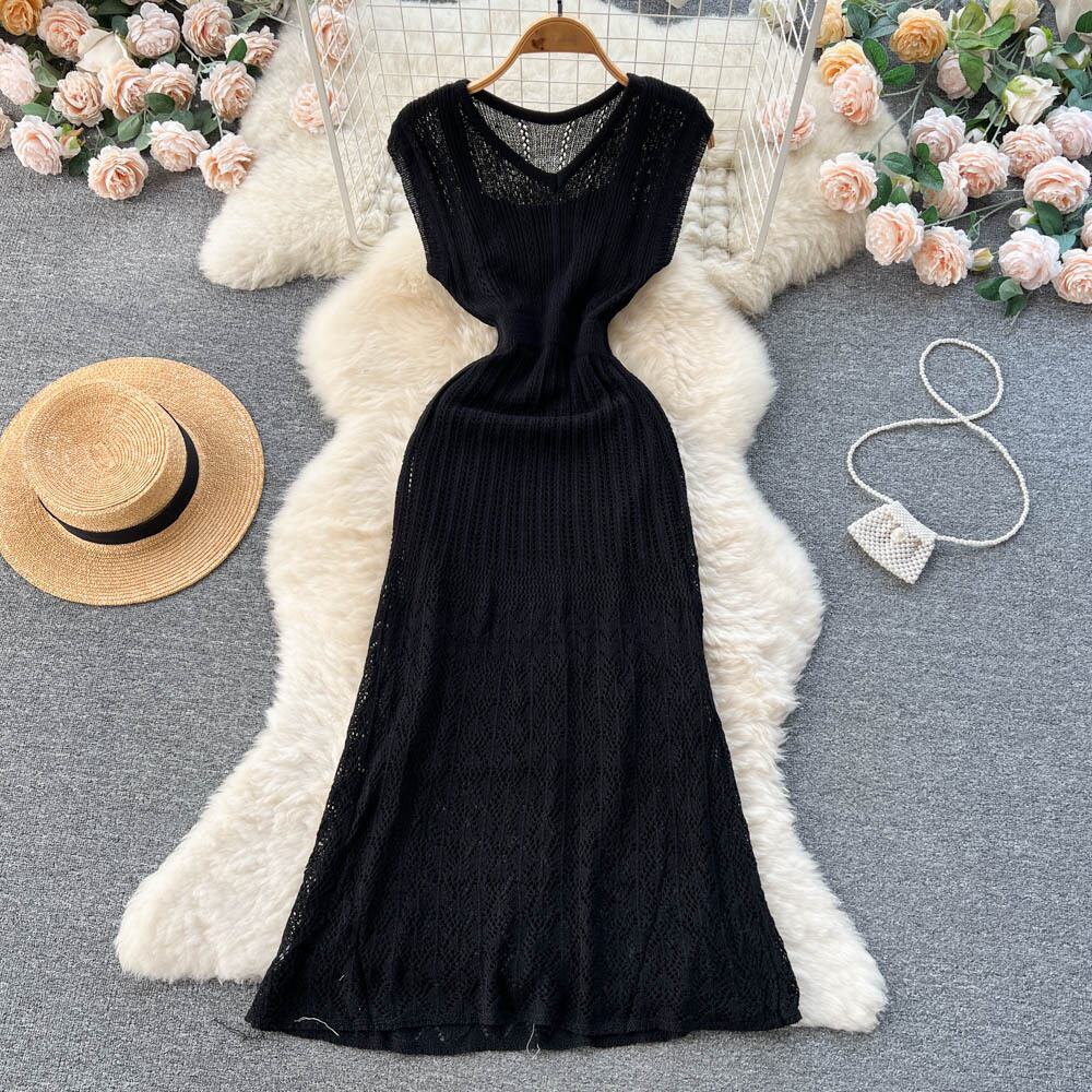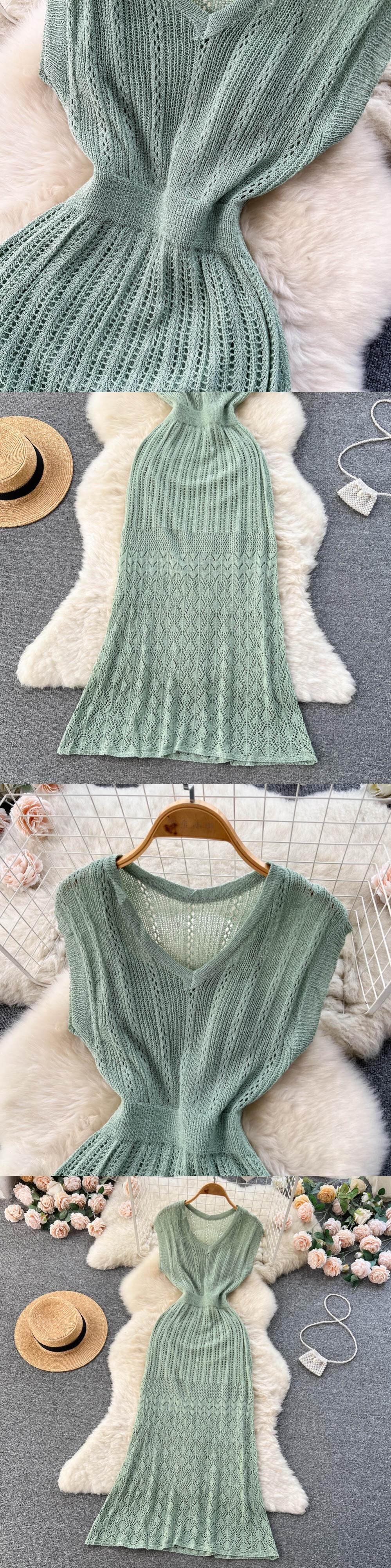 夏のシンプルな中空アウトベストニットセータードレス女性 ese 優しい V ネックスリム弾性ニットロングドレス エラスティック 伸縮 サマー 夏物 Vネック Abe90799561357
