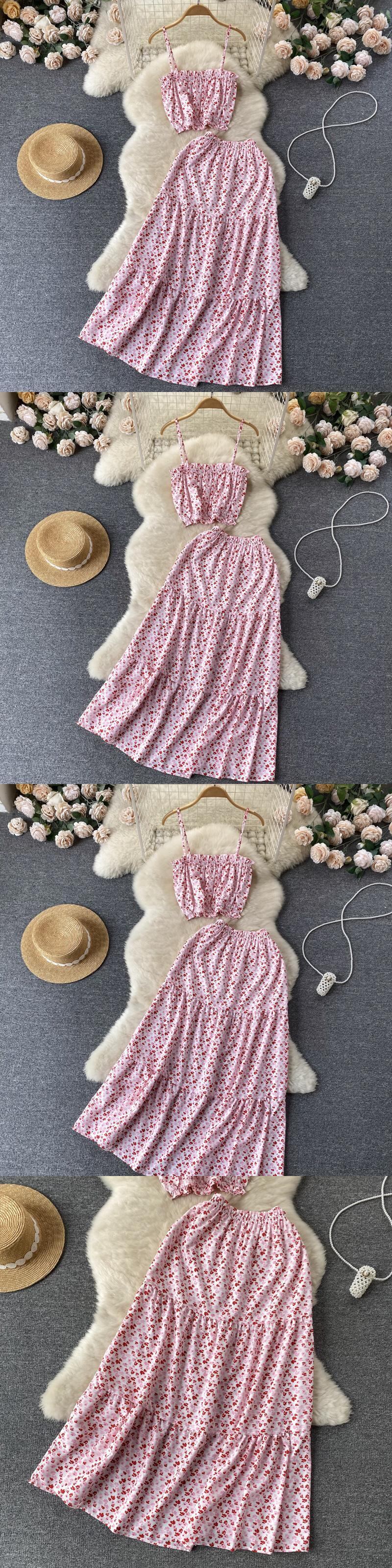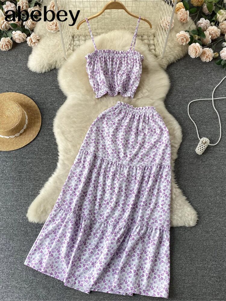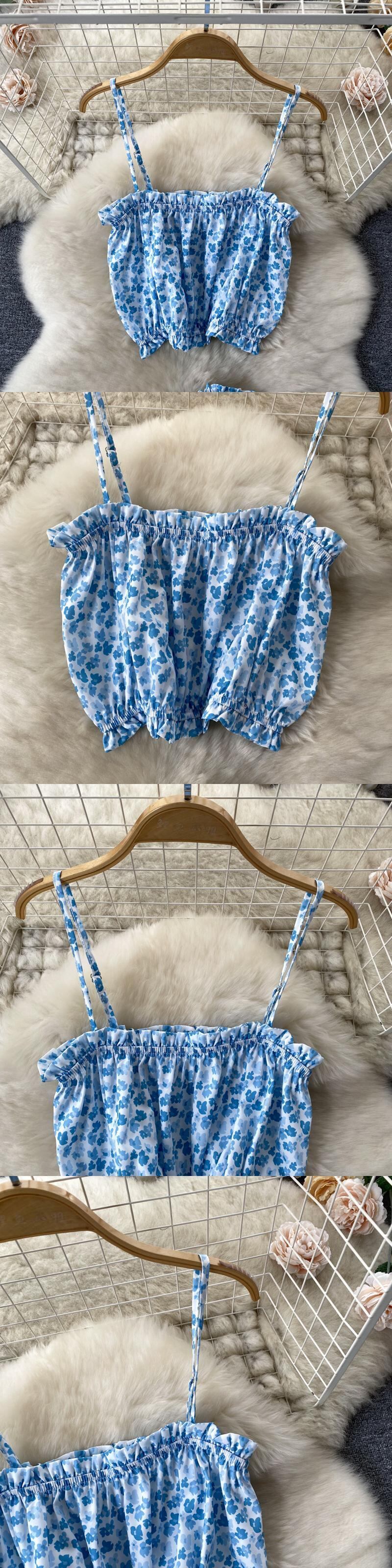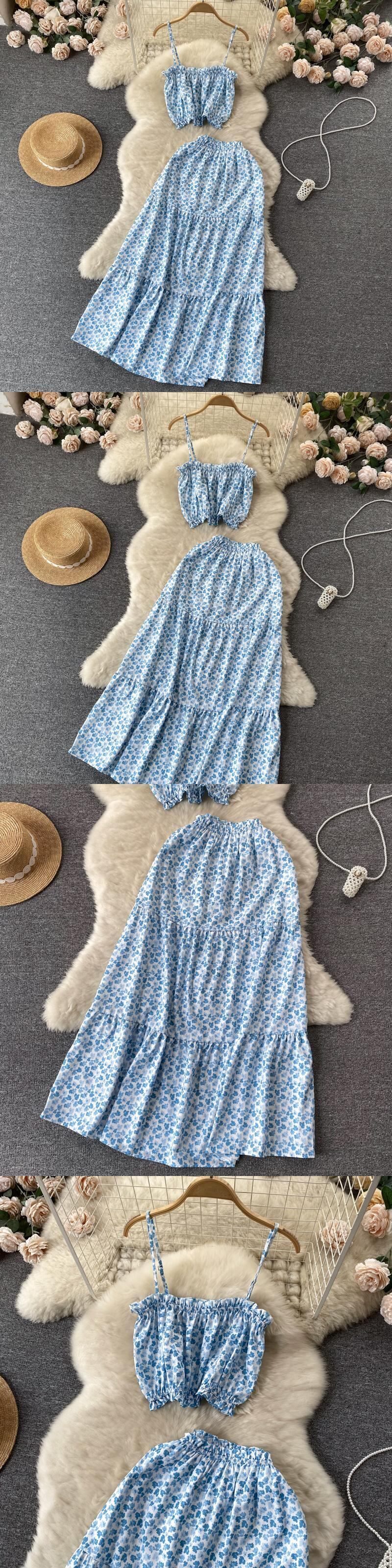 夏のボヘミアン花プリント セット女性のセクシーなキャミソール ショート トップス + ウエスト フリル ブルー スカート スーツ サマー 夏物 花柄 Abe9899582385