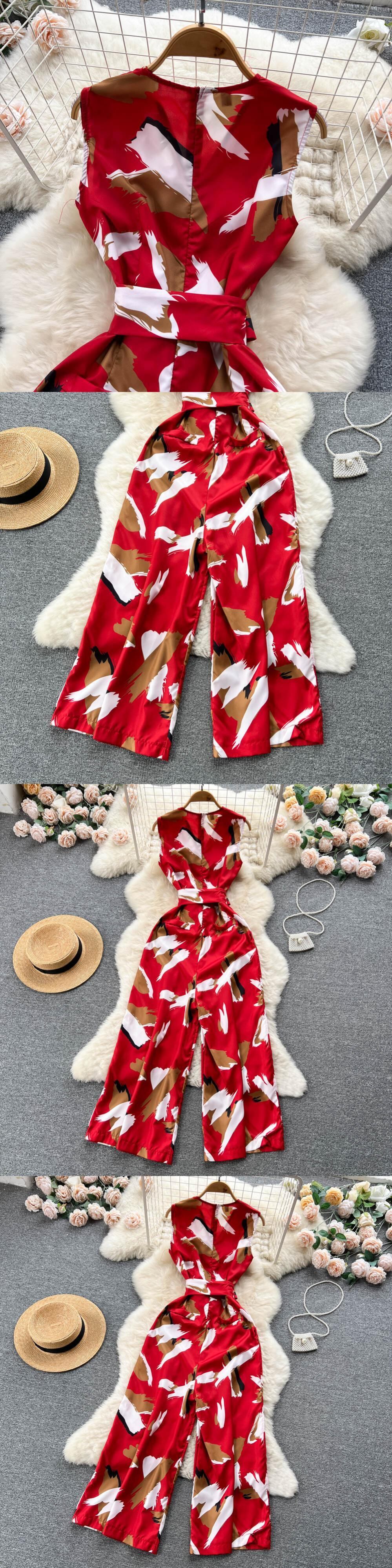 夏 V ネックノースリーブウエストジャンプスーツ女性ルーズワイドレッグロンパースとサッシロンパース & サマー 夏物 Vネック ワイドパンツ Abe5087272611