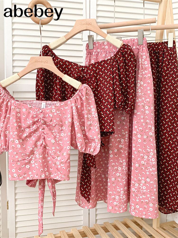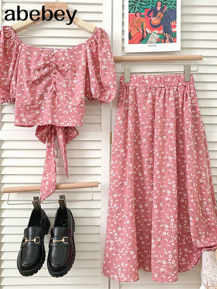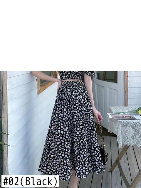 スクエアカラーパフスリーブ花柄シングルブレストショートトップス+ハイウエストミドル丈スカート2点セット夏 ハイウェスト サマー 夏物 スクウェア Abe10403898647