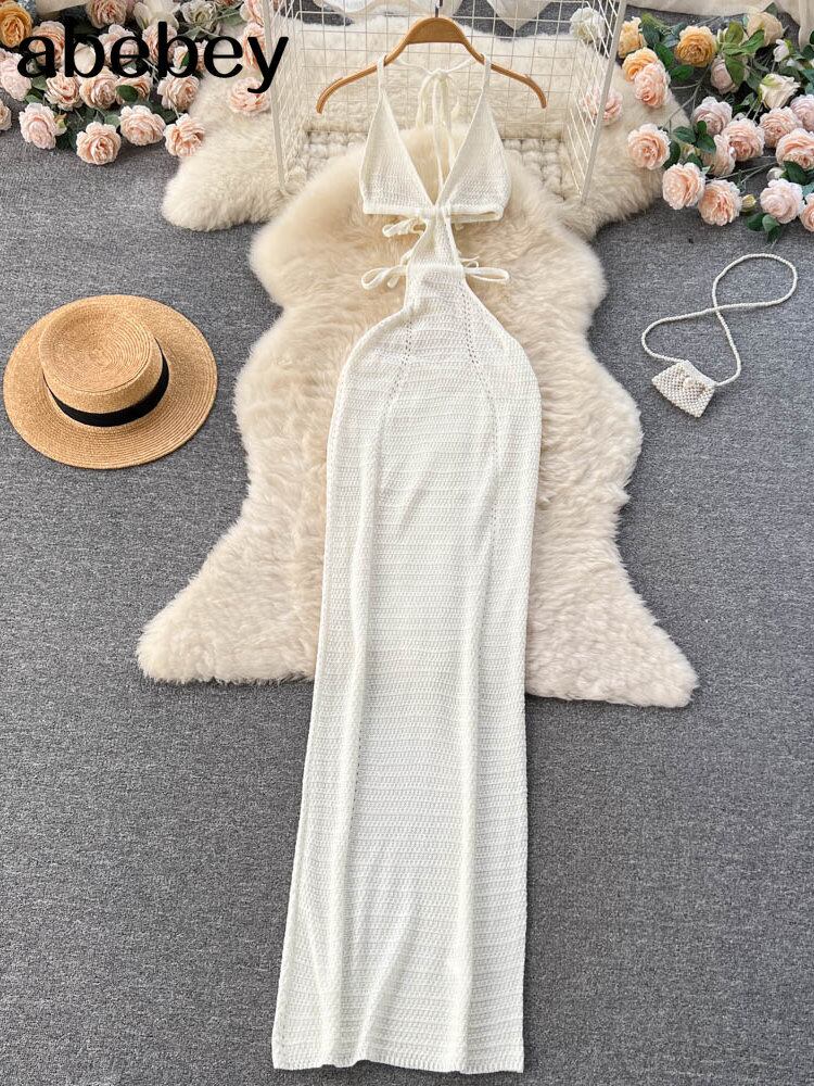 ホワイトニット背中の開いたサマードレス女性ボディコンマキシロングセクシーなドレスビーチドレス Vestidos 夏物 Abe83192257629