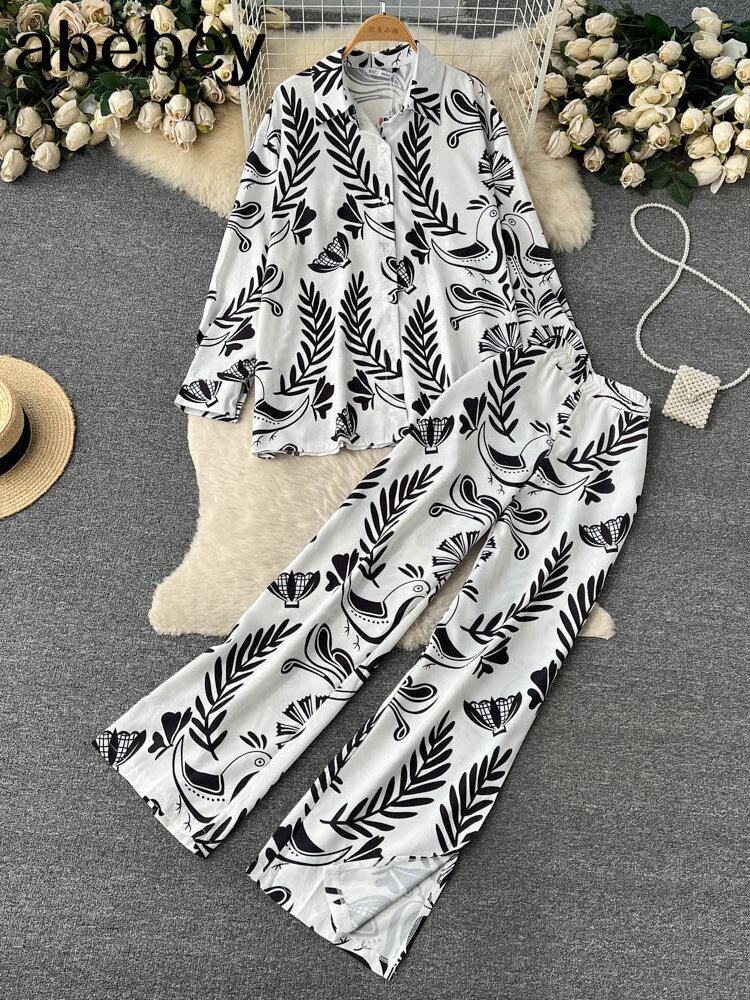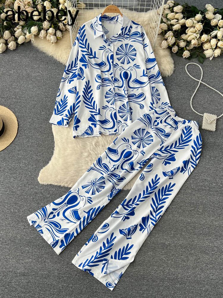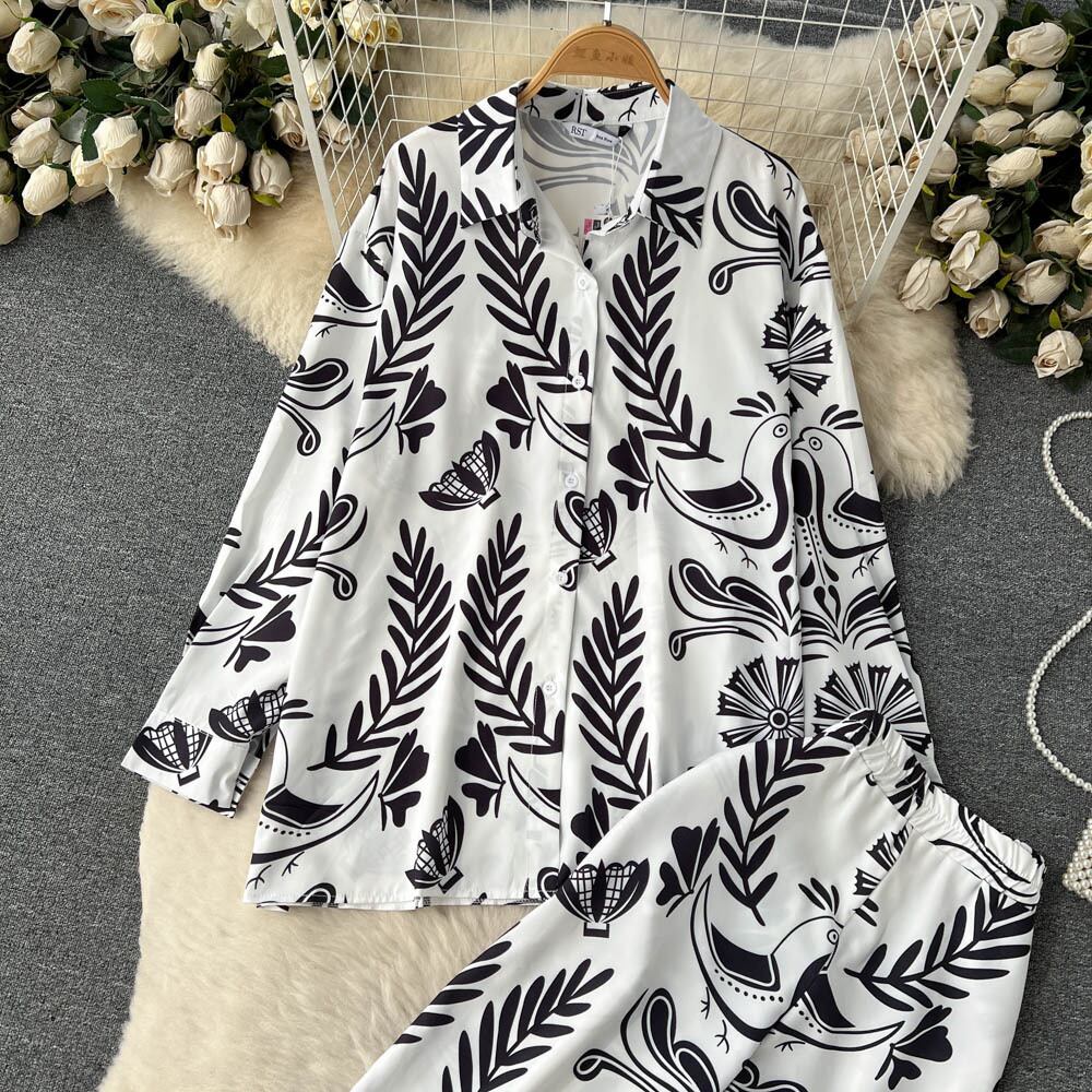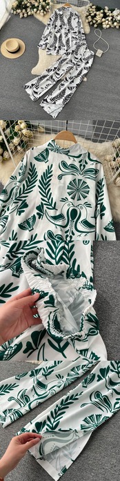 プリント ツーピーススーツ 長袖 ブラウス+ tウエスト ワイドレッグ ロングパンツ OL 秋 セット オータム 秋物 ワイドパンツ 会社 学校 通勤や通学にも Abe45791262070
