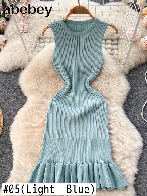夏ニットボディコンセクシードレス O ネックノースリーブフリルパーティーサンドレスストリート弾性スリムショートドレス エラスティック 伸縮 サマー 夏物 Oネック Abe46190051805