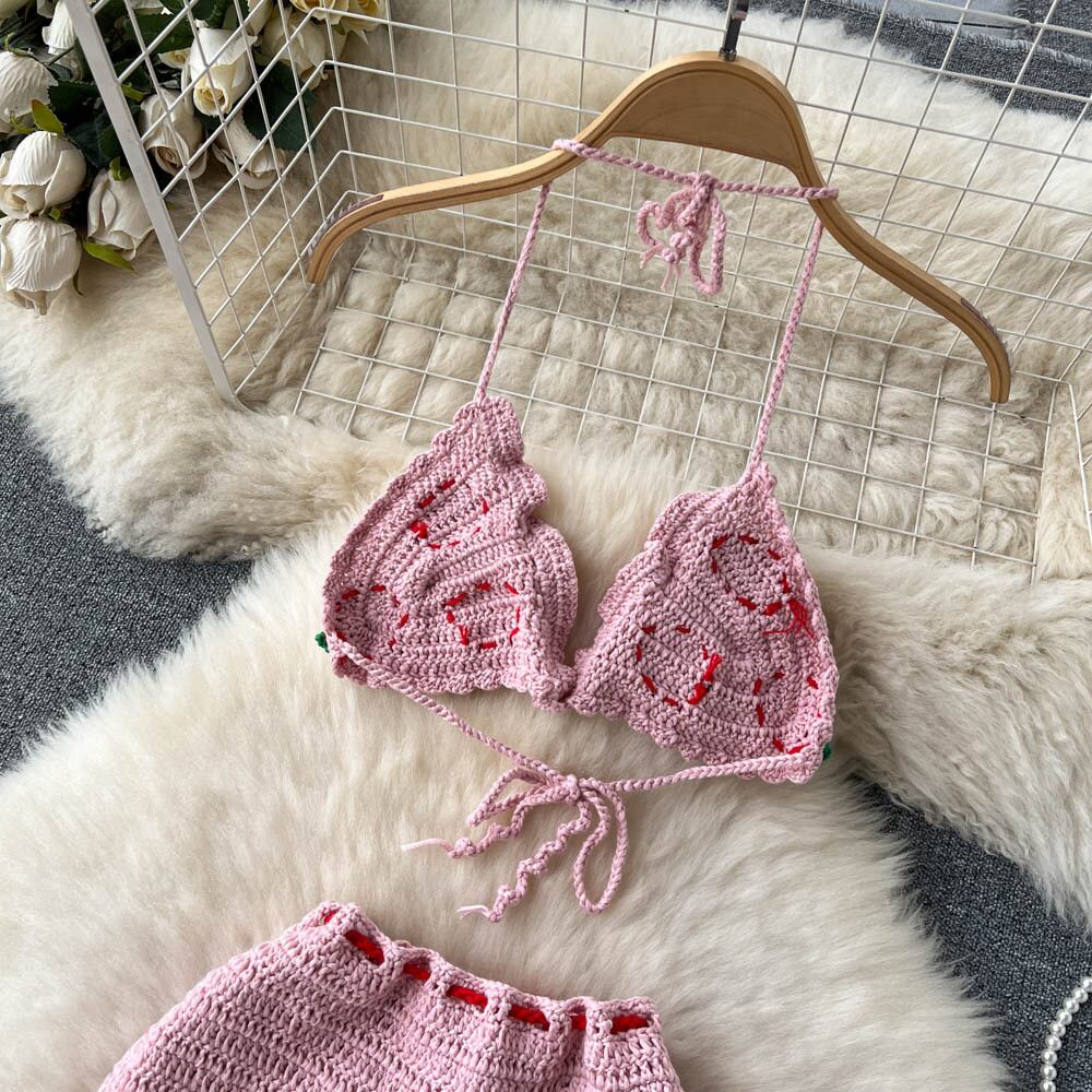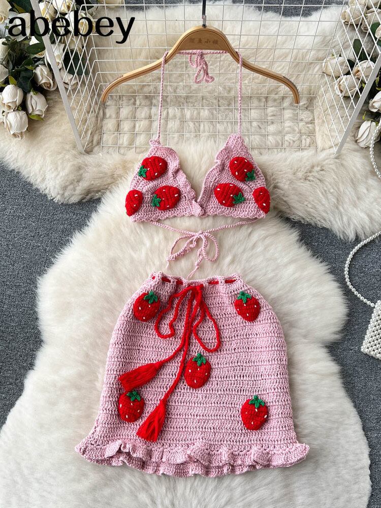 夏ニットビーチツーピースセットノースリーブストラップトップ + ミニスカートセットストロベリースウィートフリルバケーションスーツ ラッフル 大人ガーリー キュート カジュアル サマー 夏物 Abe8017248873