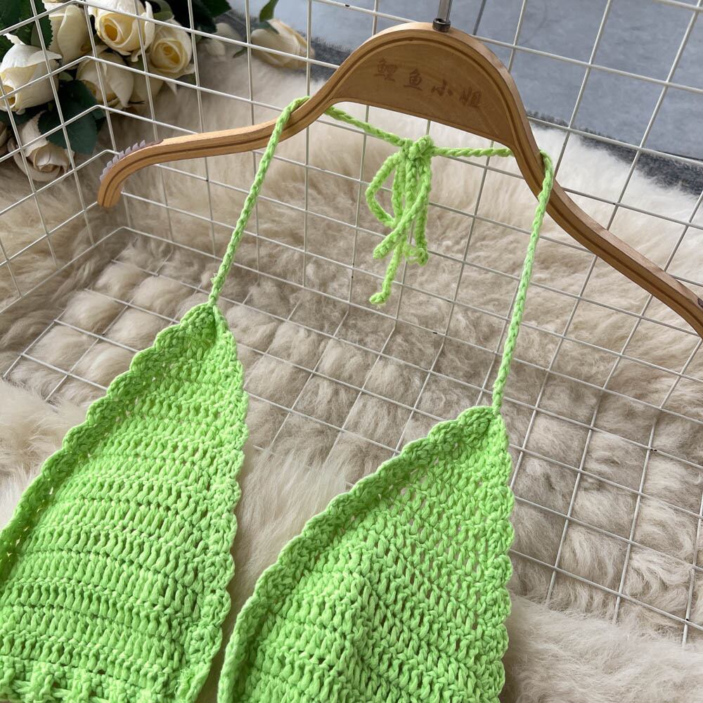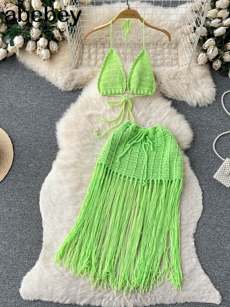 Tel Vacation ツーピーススーツ グリーン ルーズキャミソール+Aライン ロングスカートセット ウエストゴム ストライプ ニットセット エラスティック 伸縮 Abe26884404315