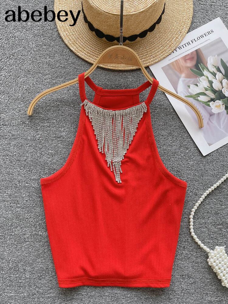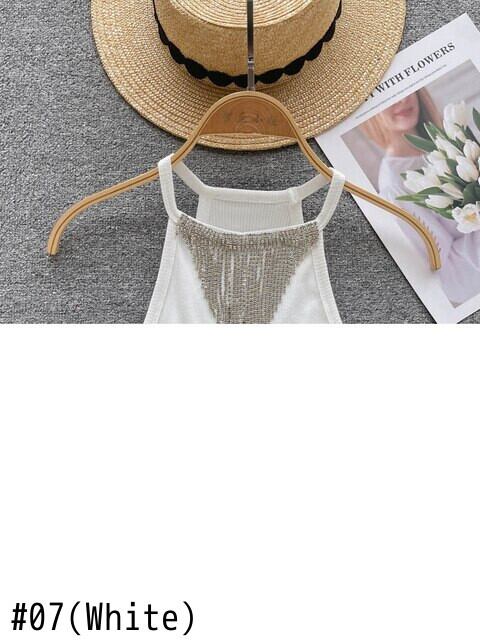 女性フリンジ ジュエル クロップ ニット タンクトップ ホルター ネック ノースリーブ キャミソール Abe7155367616