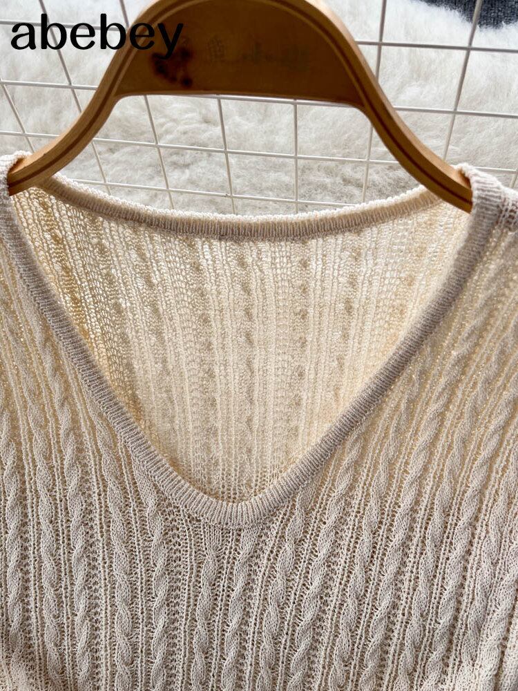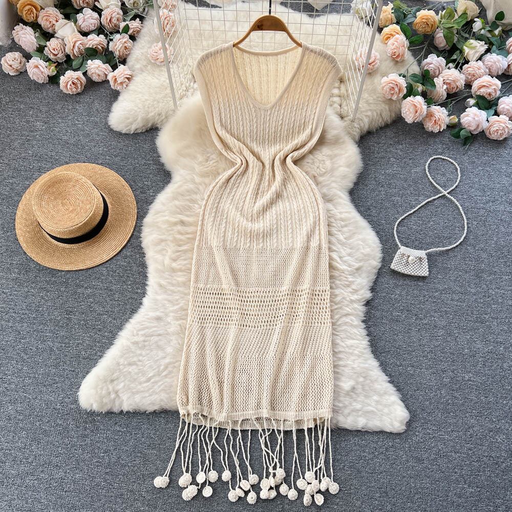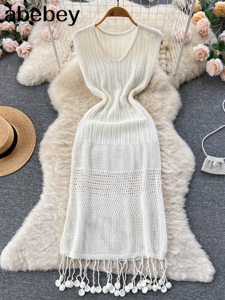 夏シンプルな中空アウト ベスト ニット セーター ドレス女性優しい V ネック スリム弾性ニット ロング ドレス エラスティック 伸縮 サマー 夏物 Vネック Abe55091928557