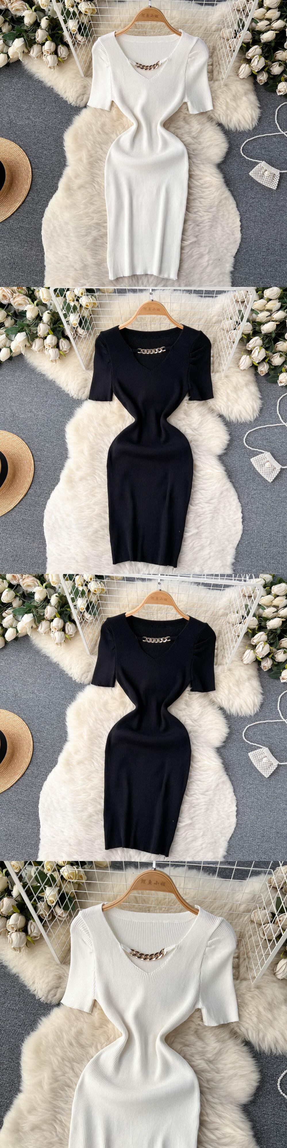 チェーン ニット サマー ドレス半袖スリム ドレスストリート弾性ショート パーティー ドレス ハーフスリーブ エラスティック 伸縮 夏物