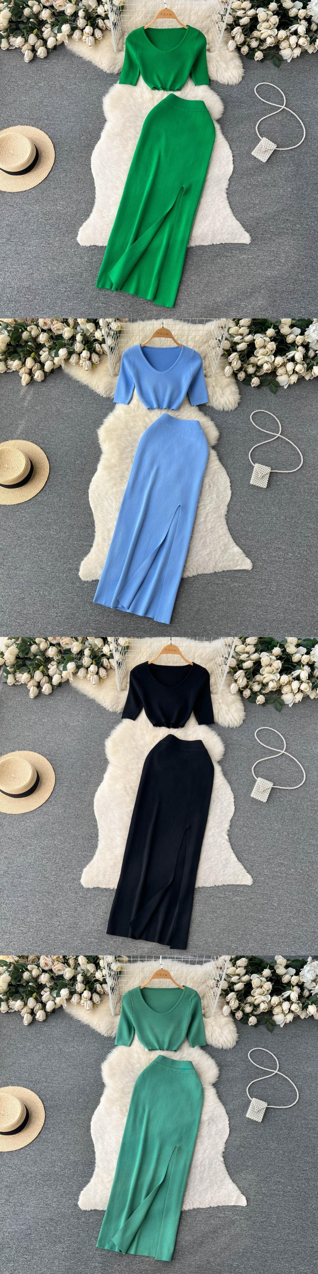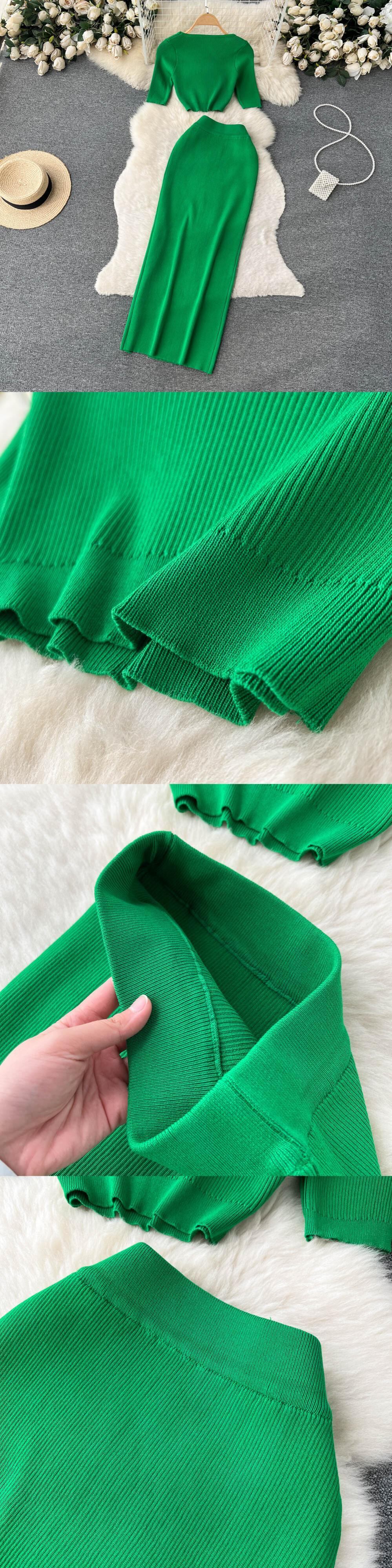 グリーンニットツーピースセットセクシーなショートクロップトップ + 弾性ウエストニットスプリットロングスカートスーツ エラスティック 伸縮 ソリッドカラー