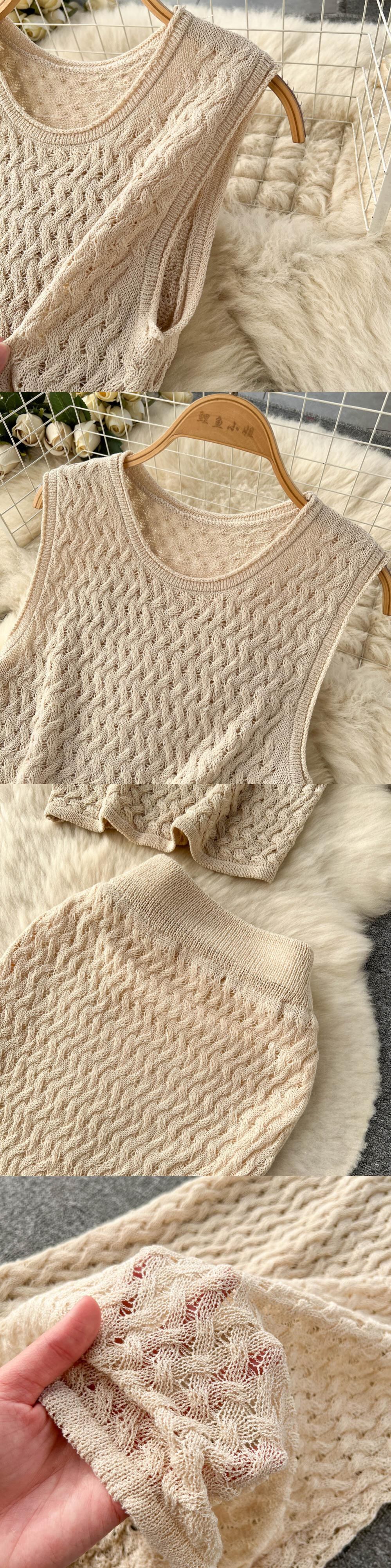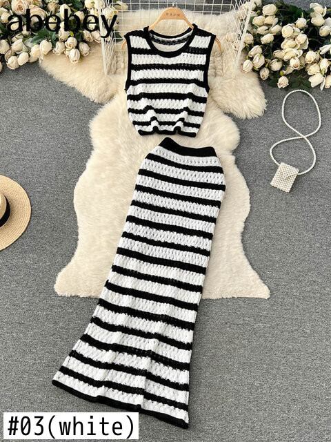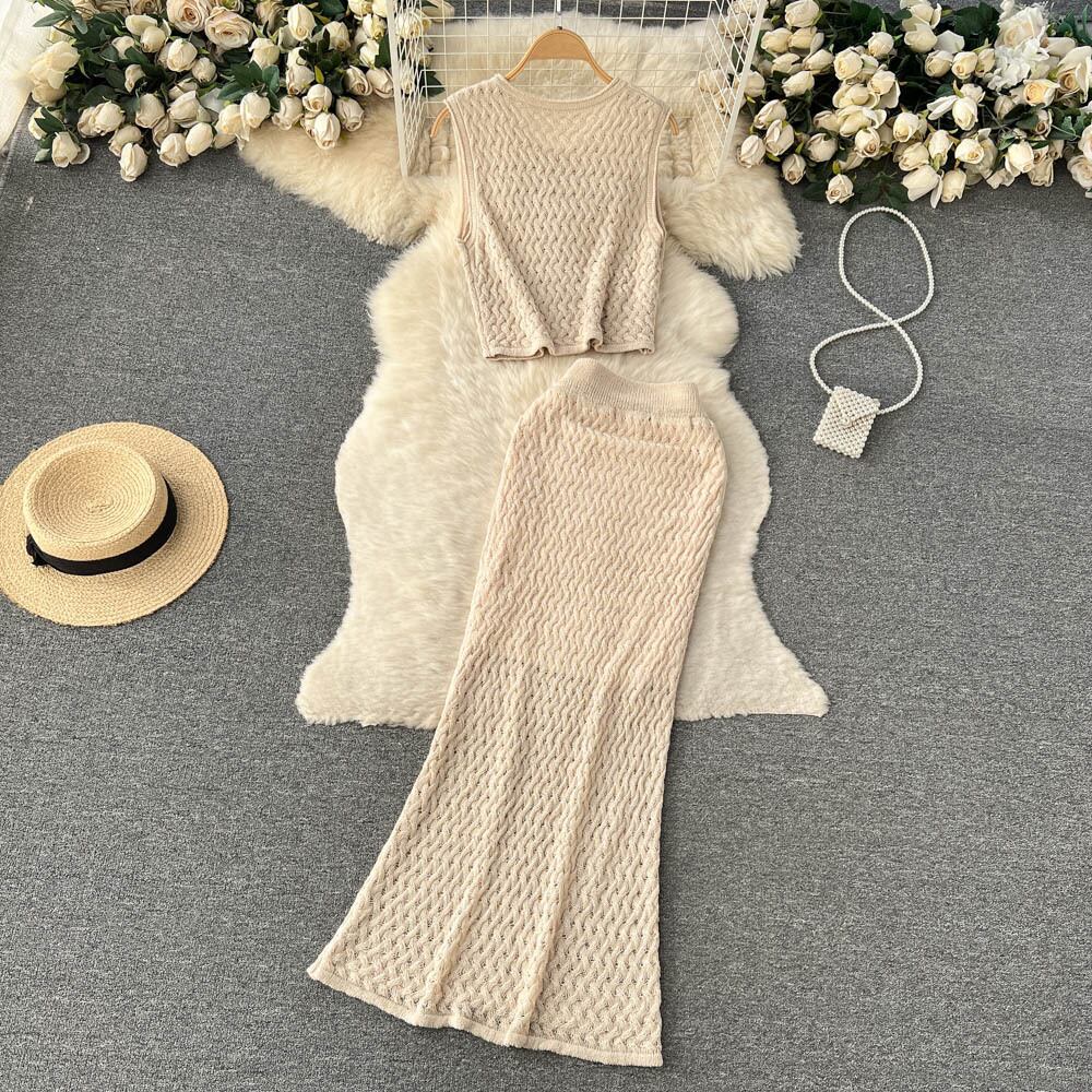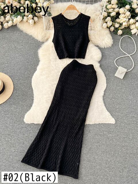夏ニットツーピーススーツ弾性シースチェック柄ロングスカートセット休暇ビーチ 2 個セット エラスティック 伸縮 サマー 夏物