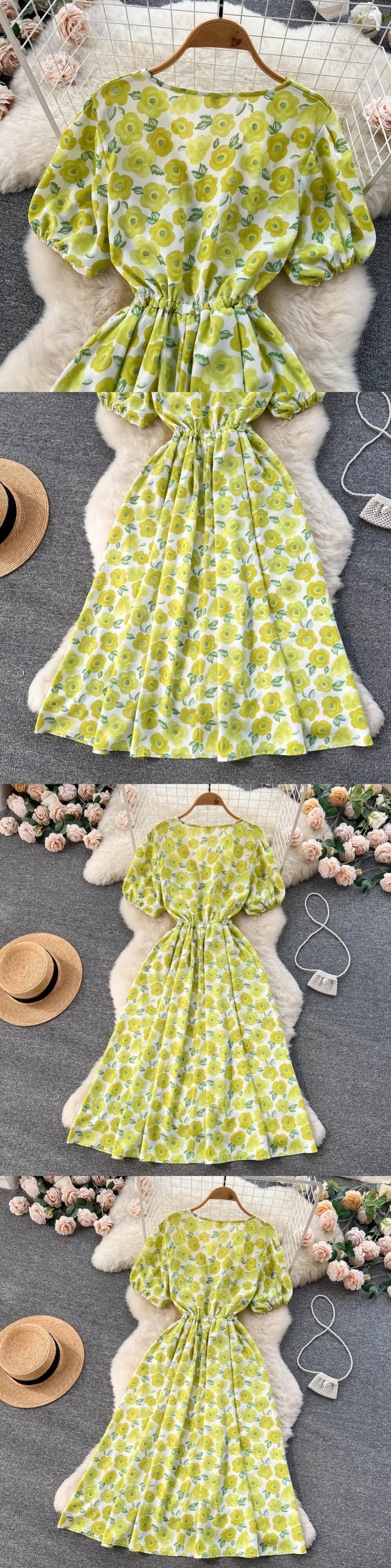 ホリデーフローラルシフォンドレスの夏の半袖 V ネック弾性ウエストスリム A ラインビーチロングドレス ショート ハーフスリーブ エラスティック 伸縮 サマー 夏物 花柄 Vネック Aライン