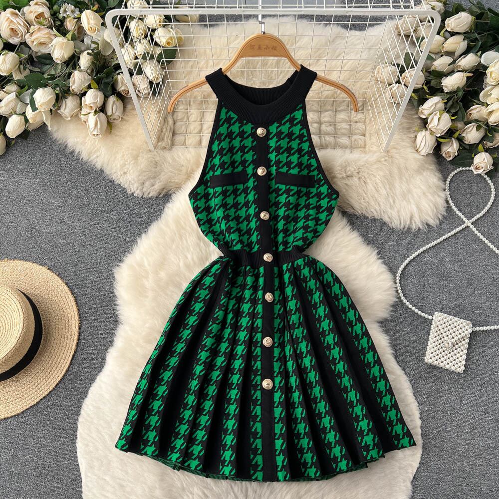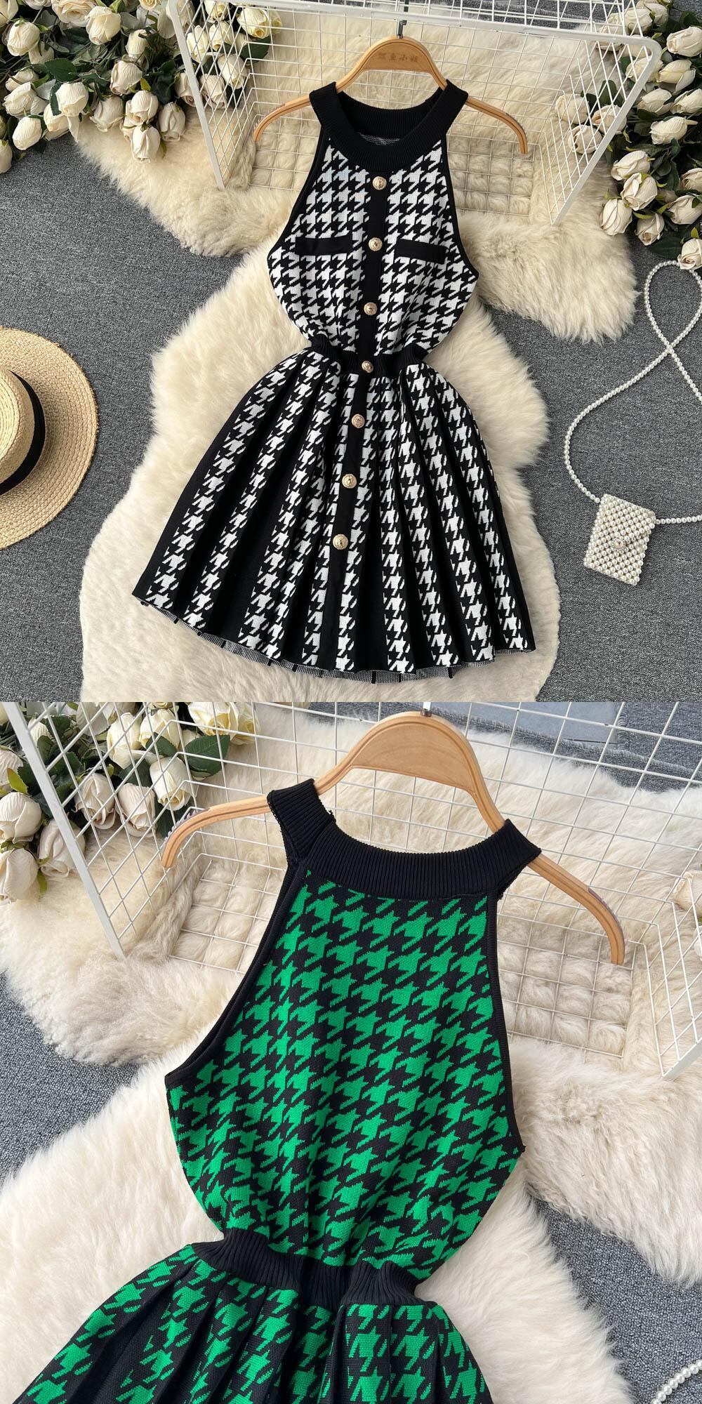 夏に人気のノースリーブクリック千鳥柄プリーツニットホルタータンクワンピース サマー 夏物