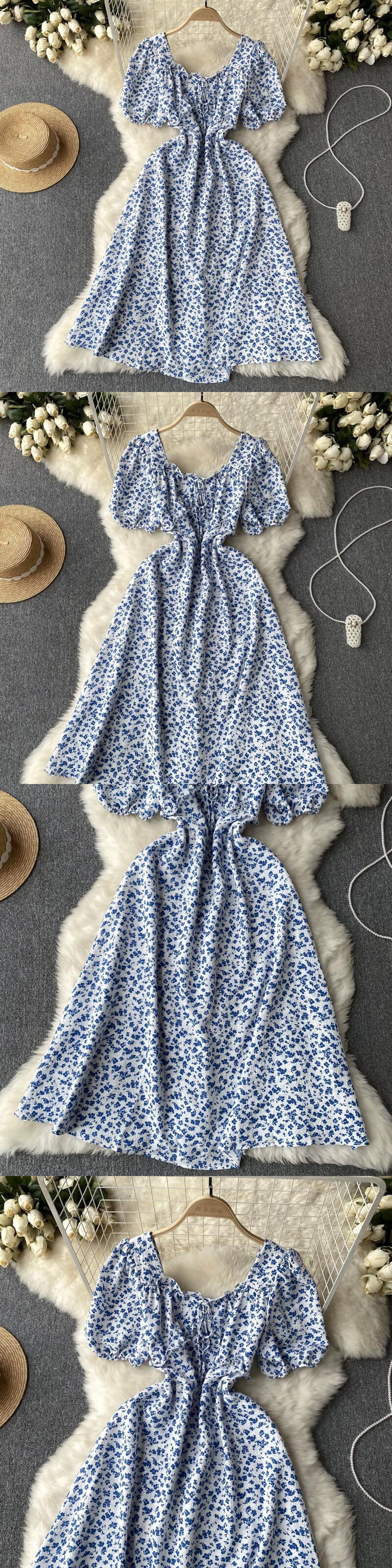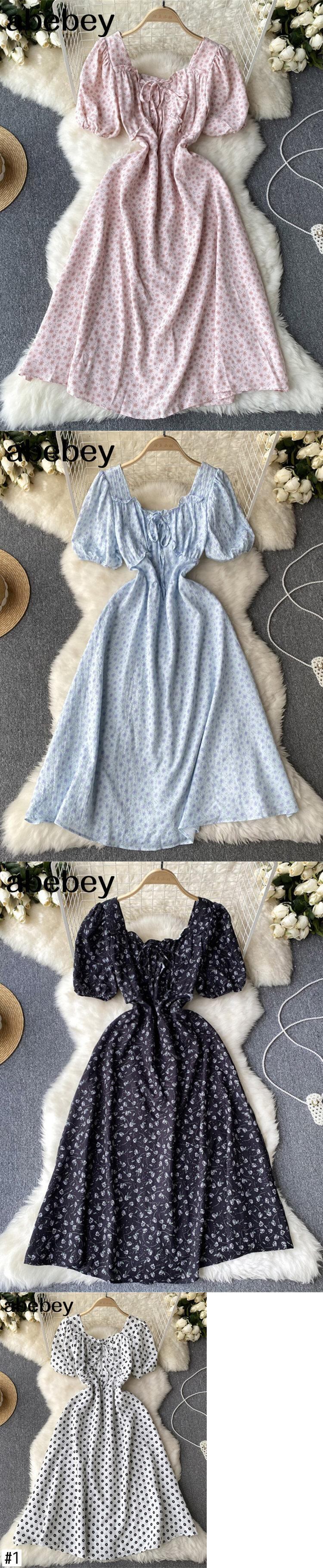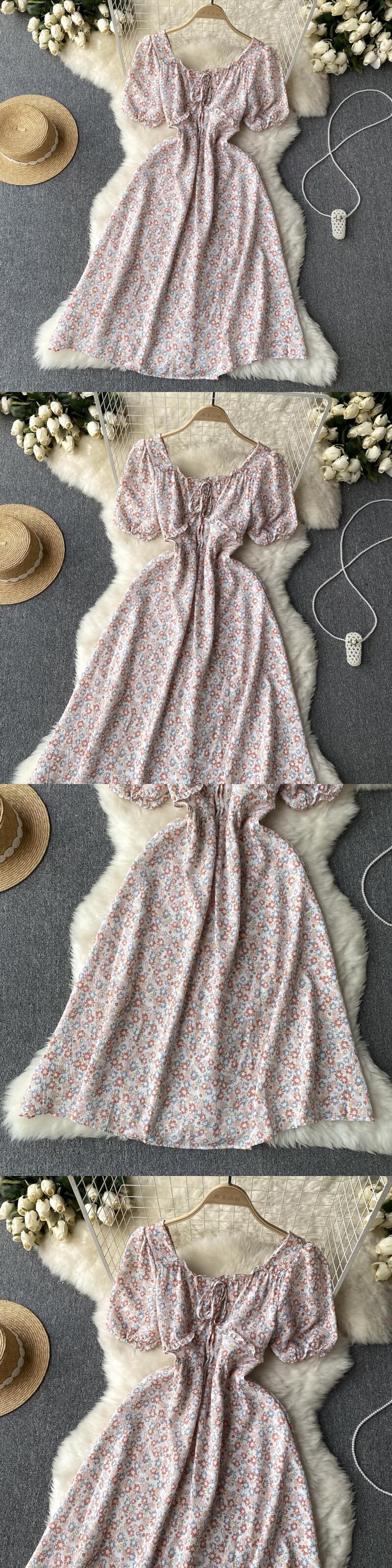 花プリント シフォン ロング ドレス夏スクエア カラー プリーツ弾性ウエスト A ライン ドレス半袖服 ショート ハーフスリーブ エラスティック 伸縮 サマー 夏物 花柄 Aライン スクウェア