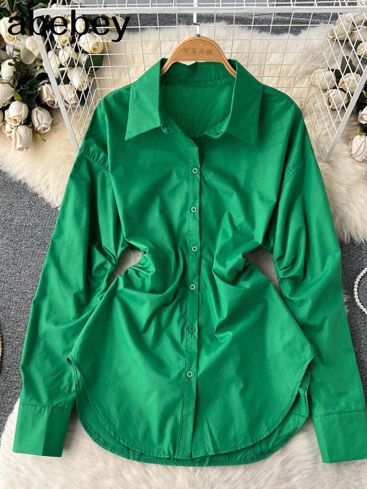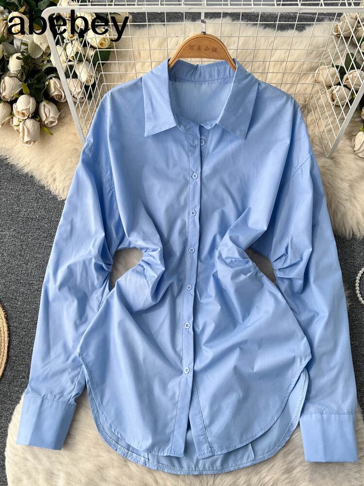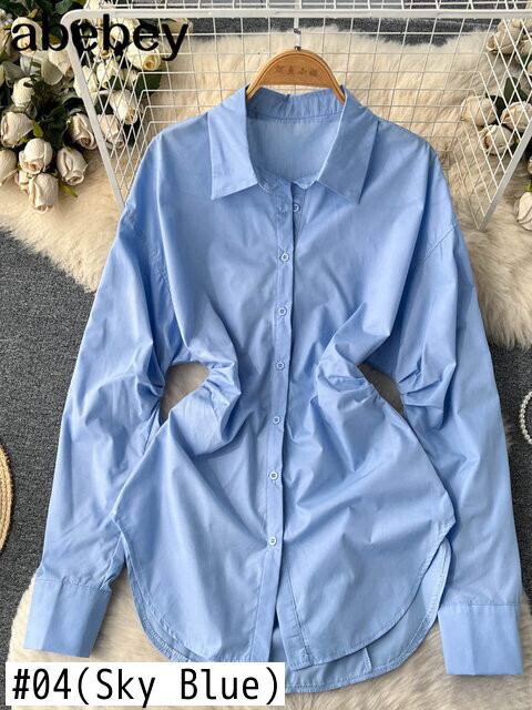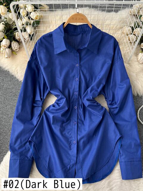 春長袖無地シックなプリーツ ラペル シャツブラウス トップス ロング スプリング 春物 ソリッドカラー