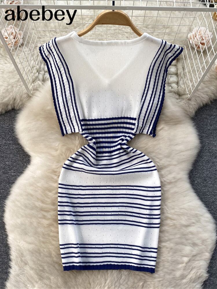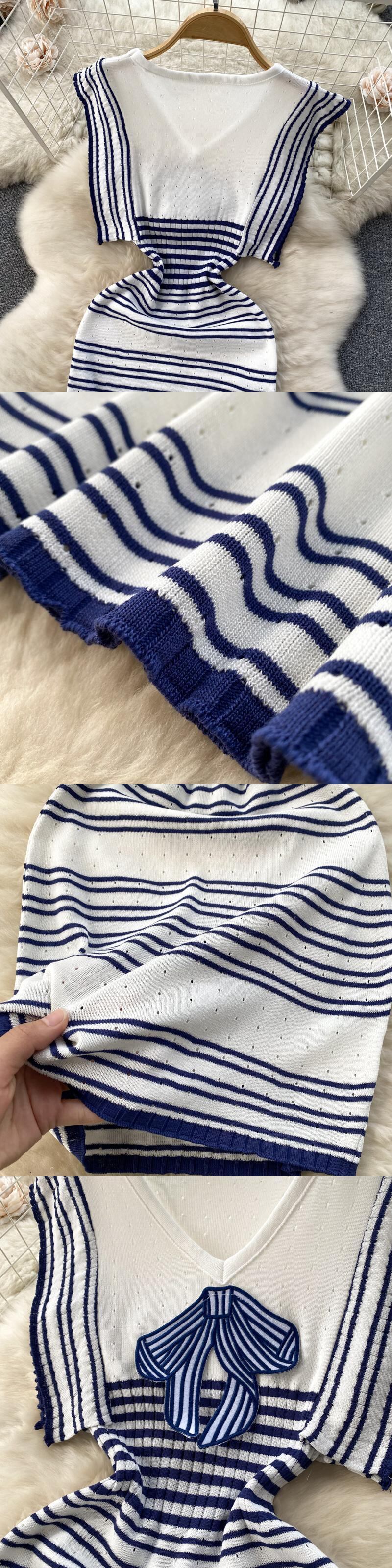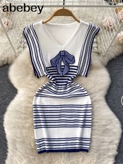 夏ストライプ ニット ミニ ドレス弓シックなプレッピー スタイル シース ドレス ストリート Y2K スリム ビーチ サンドレス リボン サマー 夏物