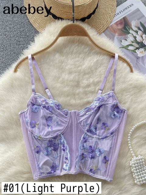 夏レースアップ刺繍キャミソールスリングスリムシックなメッシュトップストリートスタイル花セクシーなタンクトップ サマー 夏物 花柄
