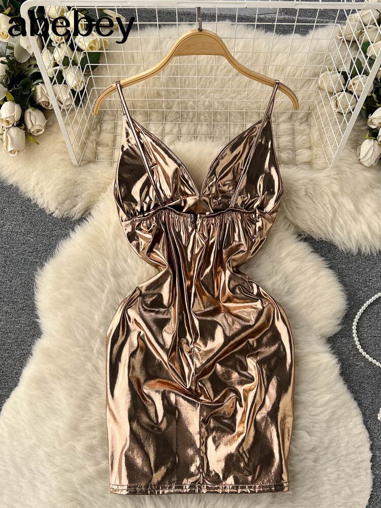 夏のストラップ光沢のあるパーティードレス V ネックノースリーブスリム背中の開いたショートサンドレスストリートシャーリングビーチミニドレス サマー 夏物 Vネック