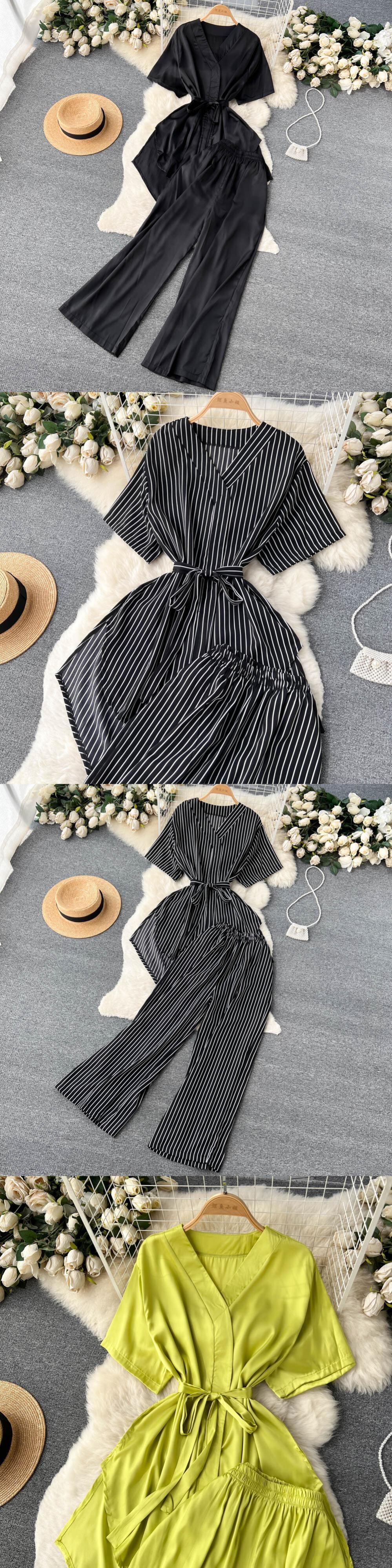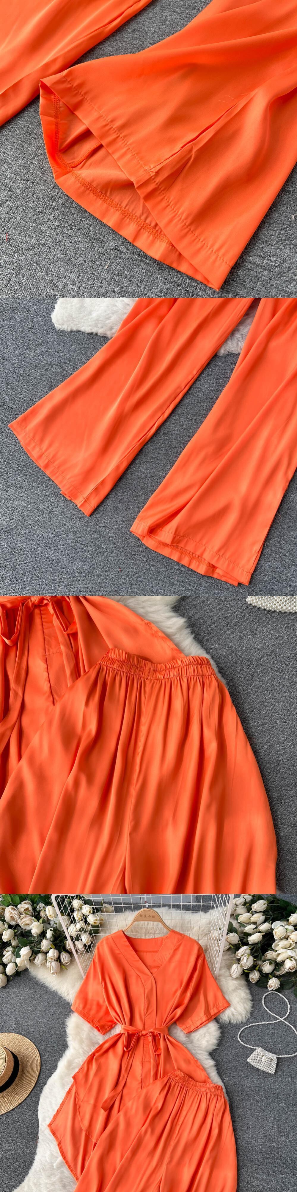 職業 OL セット V ネック フリル半袖トップス + ワイドレッグ パンツ サマー ストリート ツーピース スーツ ショート ハーフスリーブ ラッフル 夏物 Vネック ワイドパンツ