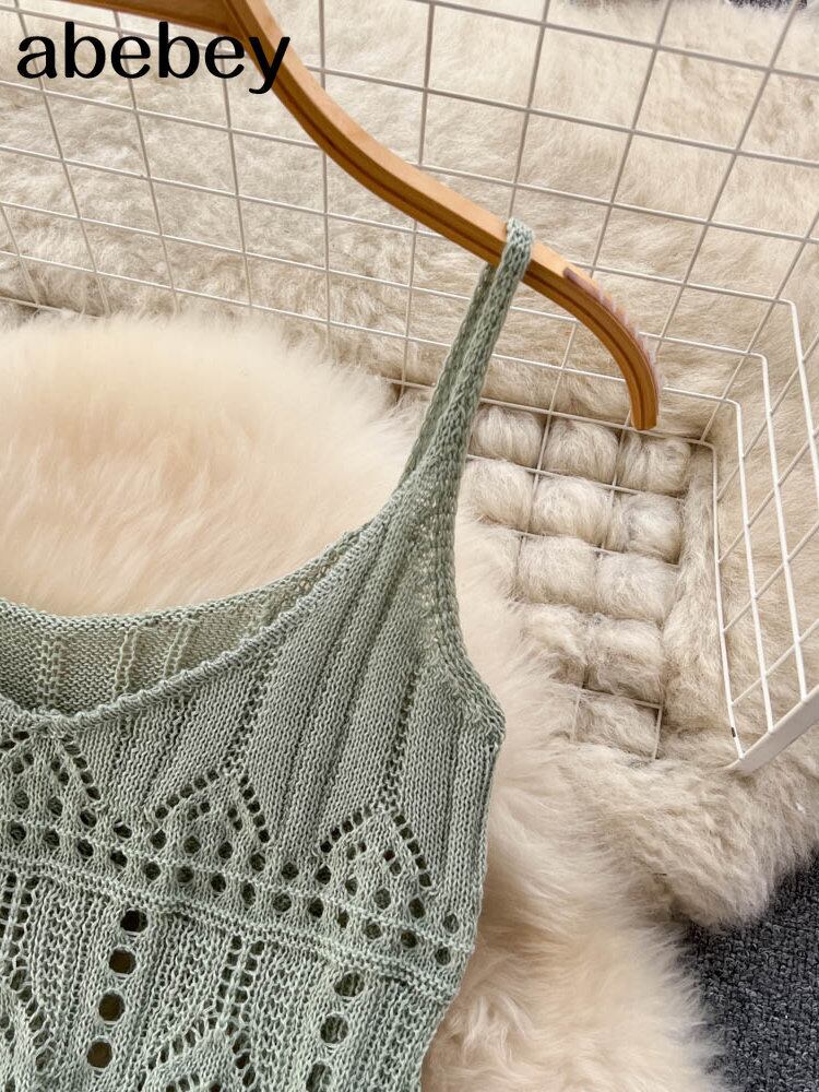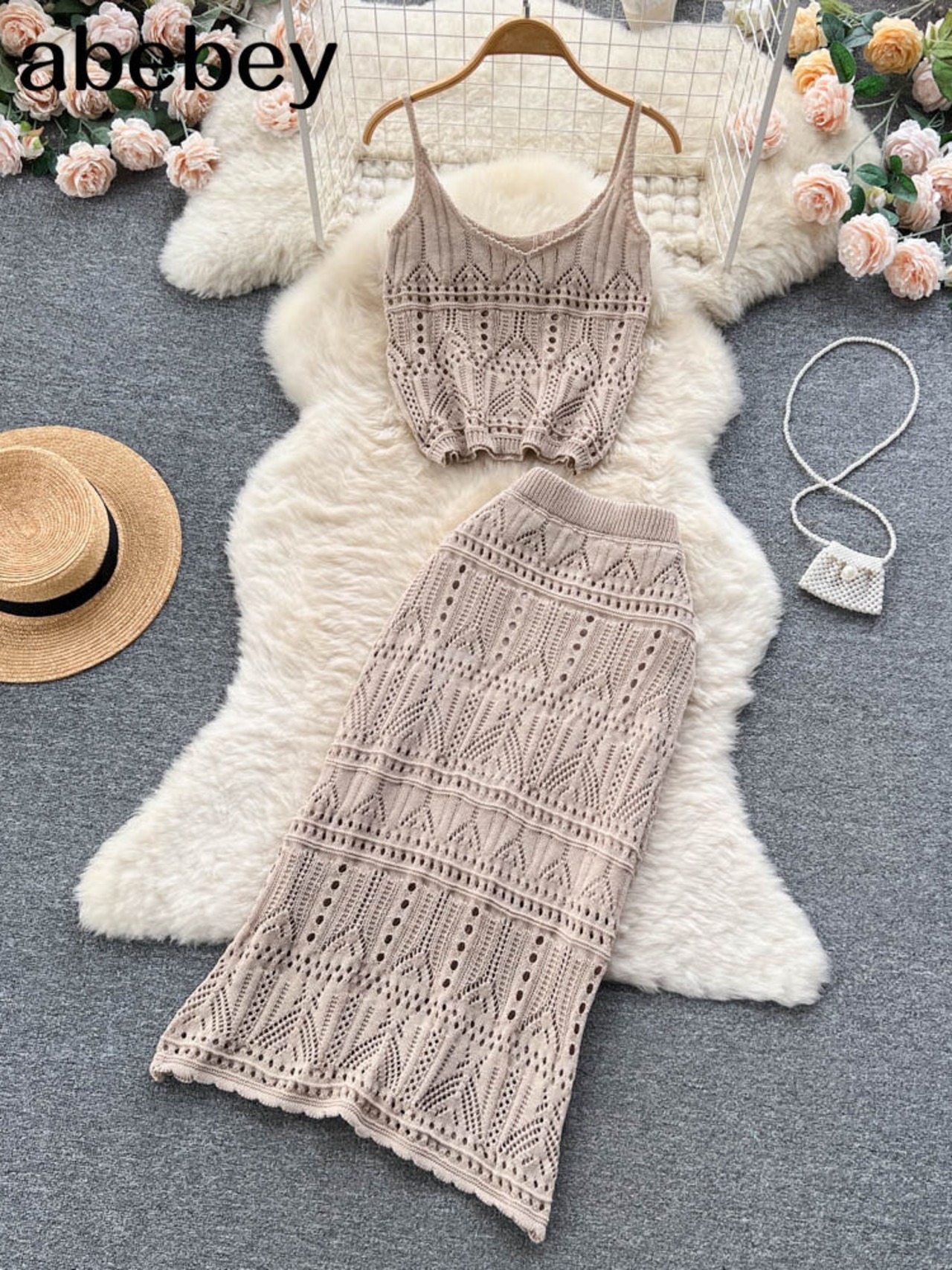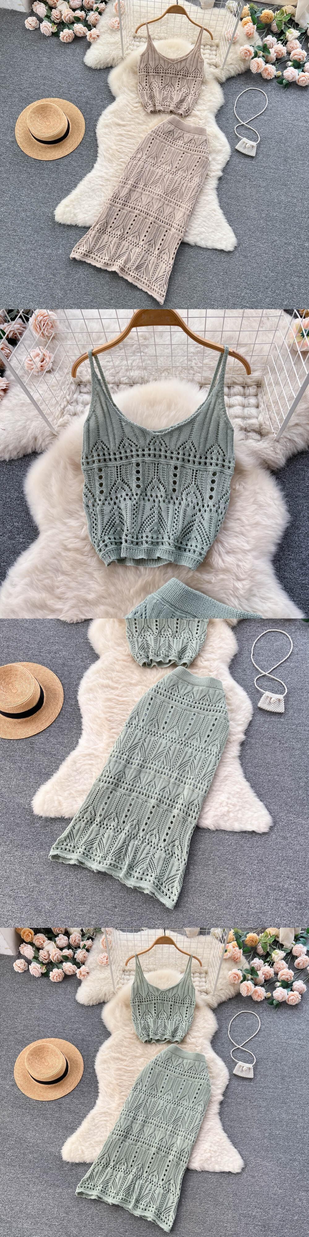 ボヘミアンバケーションビーチニットセットキャミソールショートトップス + シースロングスカート中空アウト夏ツーピーススーツ サマー 夏物