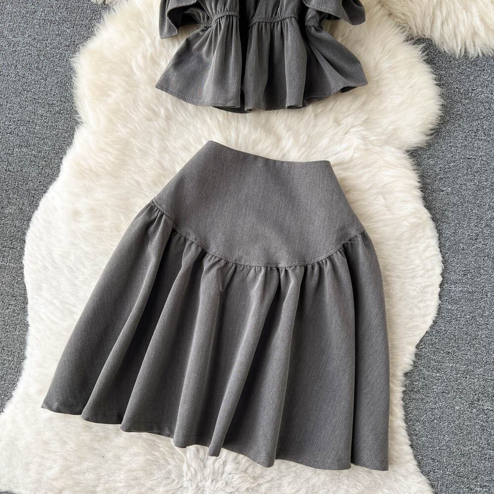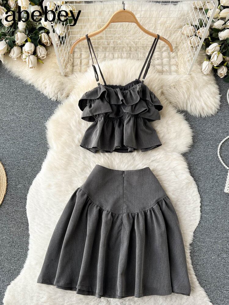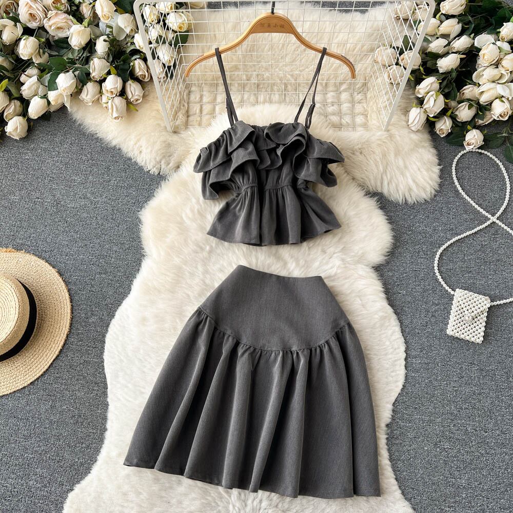夏のビーチスーツノースリーブフリルキャミソール + ショートプリーツスカート OL イングランドスタイルのセクシーな 2 点セット ラッフル サマー 夏物 ヨーロピアン