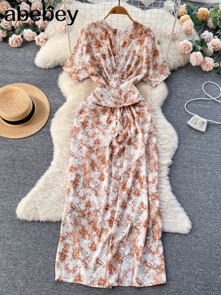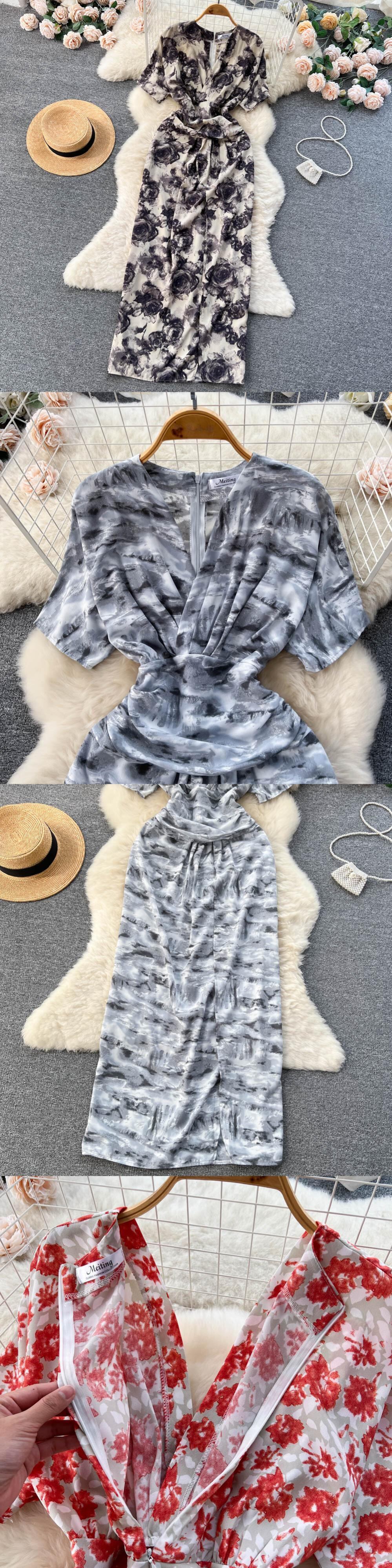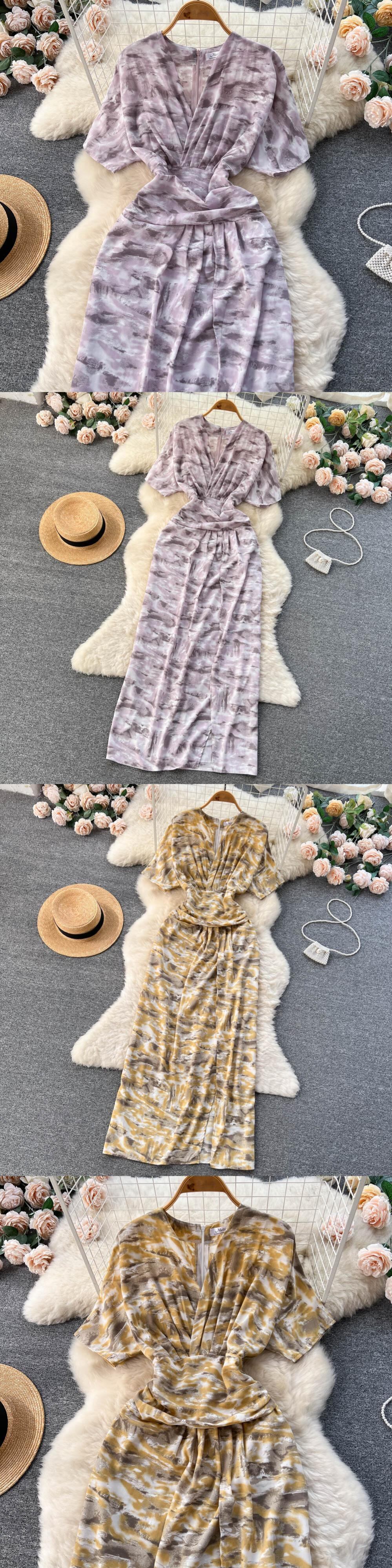 の V ネック半袖プリーツ花柄ドレス夏の海辺の休日スタイル ウエスト A ライン ビッグ スイング ロング ドレス ショート ハーフスリーブ サマー 夏物 Vネック Aライン