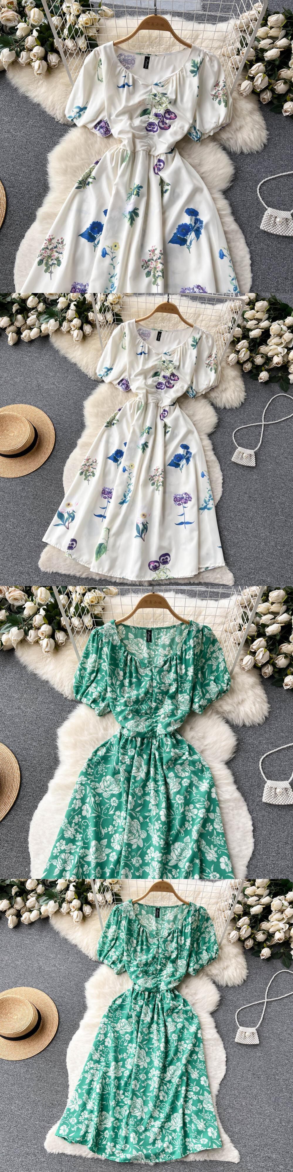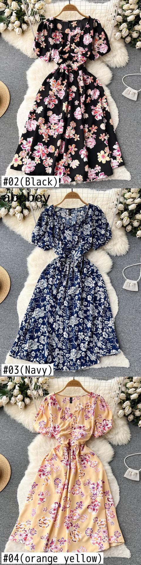 サマーホリデービーチフローラルドレスVネックスリムパフスリーブAラインファッションストリートロングドレス 夏物 花柄