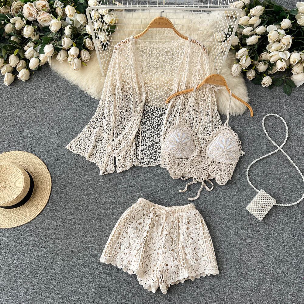 の夏のレースのスーツセクシーな背中の開いたストラップトップ + 半袖カーディガン + ウエストショートパンツ 3 点セット ハーフスリーブ サマー 夏物
