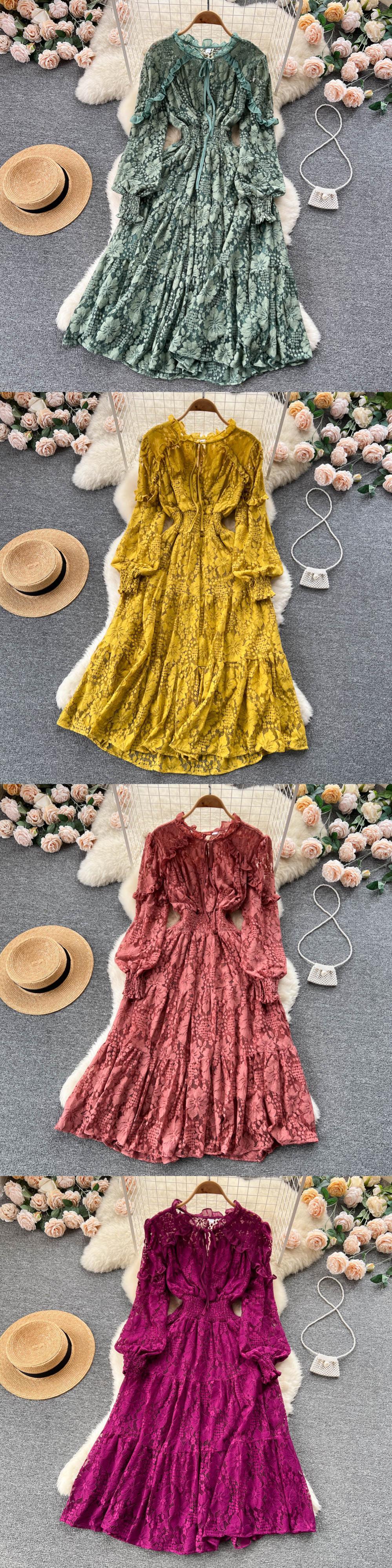 レースフレンチレトロドレス春シニアロングランタンスリーブパッチワークスリムウエストジッパーレース無地パーティードレス スプリング 春物 ソリッドカラー