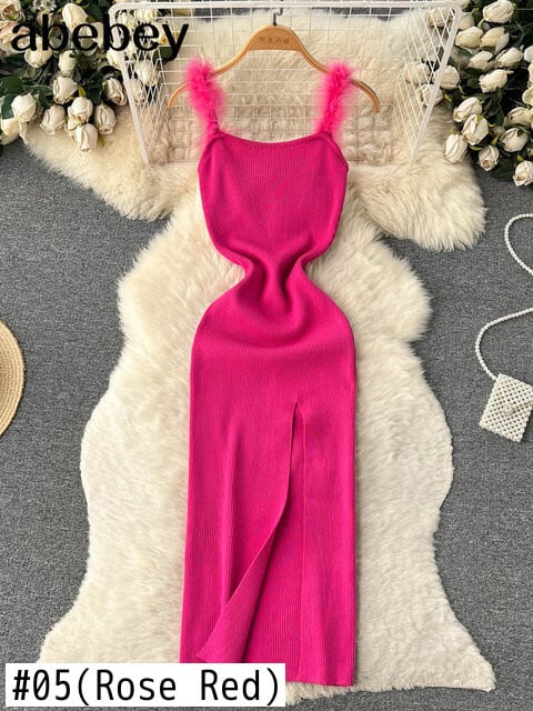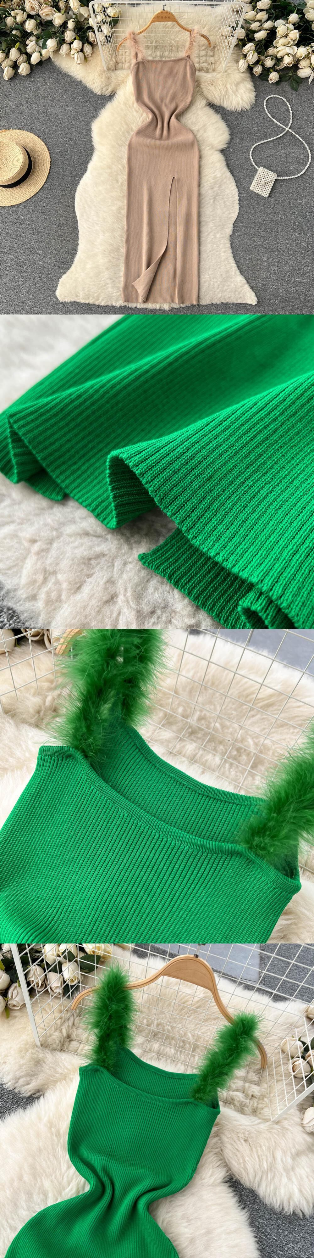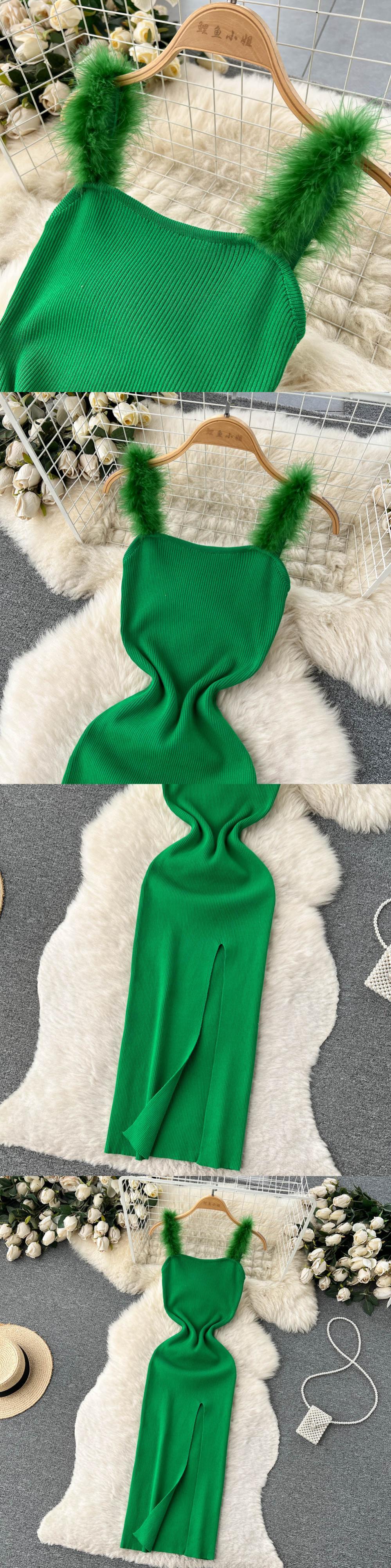 グリーンサマーニットセクシーストラップドレスエラティックウエストボディコンサンドレスビーチスプリットバックレスロングドレス 夏物