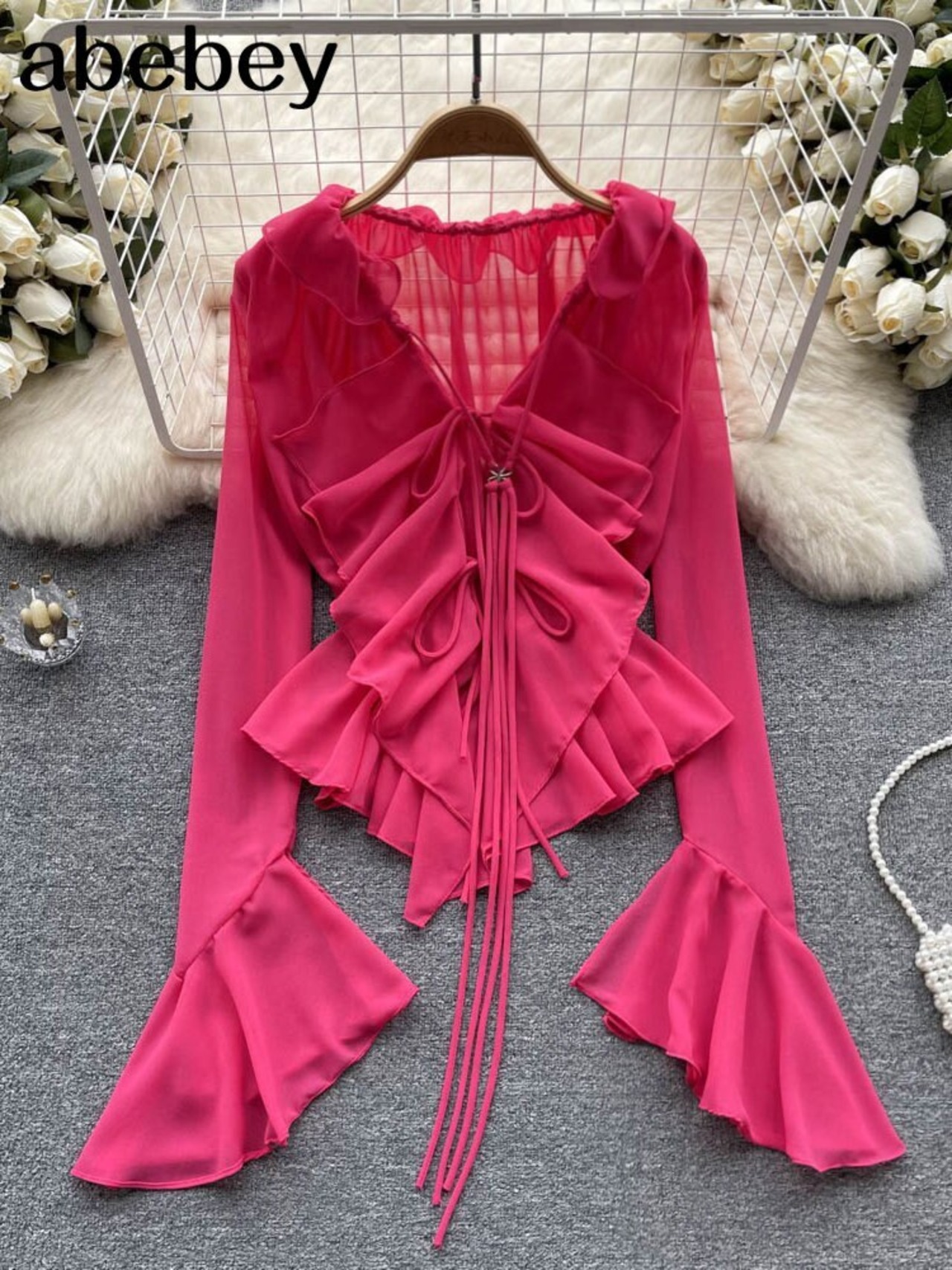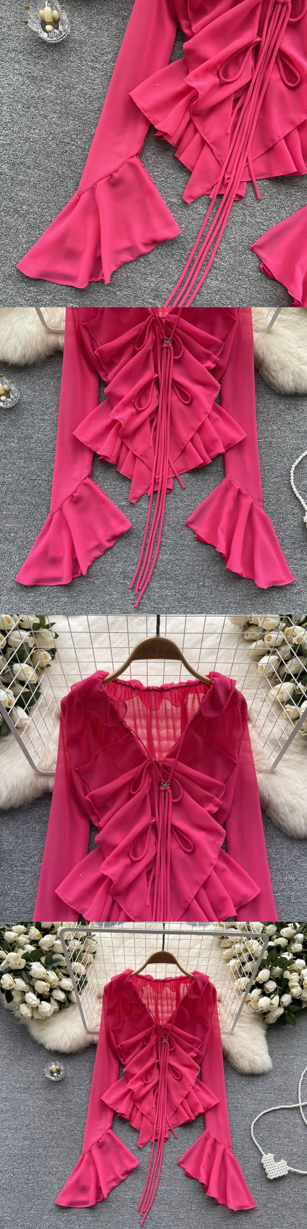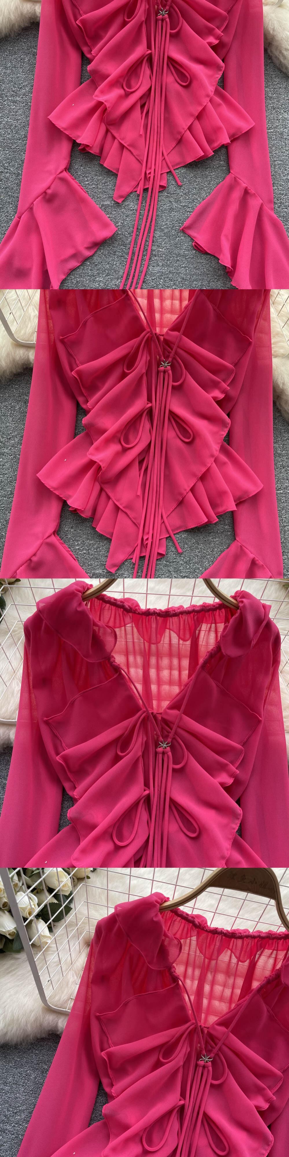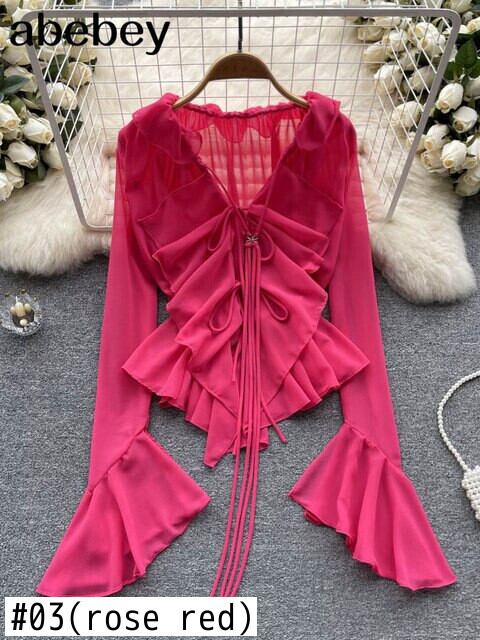 メッシュシアータイアップクロップトップスロングフレアスリーブ V ネックフリルトップスとブラウス夏セクシーなシャツ サマー 夏物 Vネック