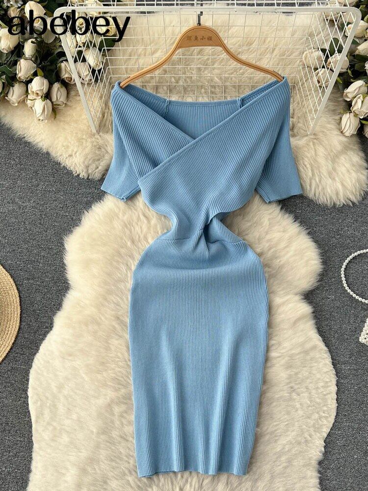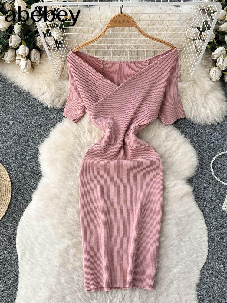 オフショルダーショートニットドレス半袖クロススリムサンドレスストリートボディコンセクシードレス ハーフスリーブ