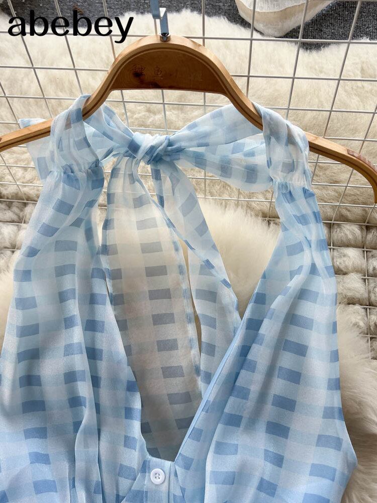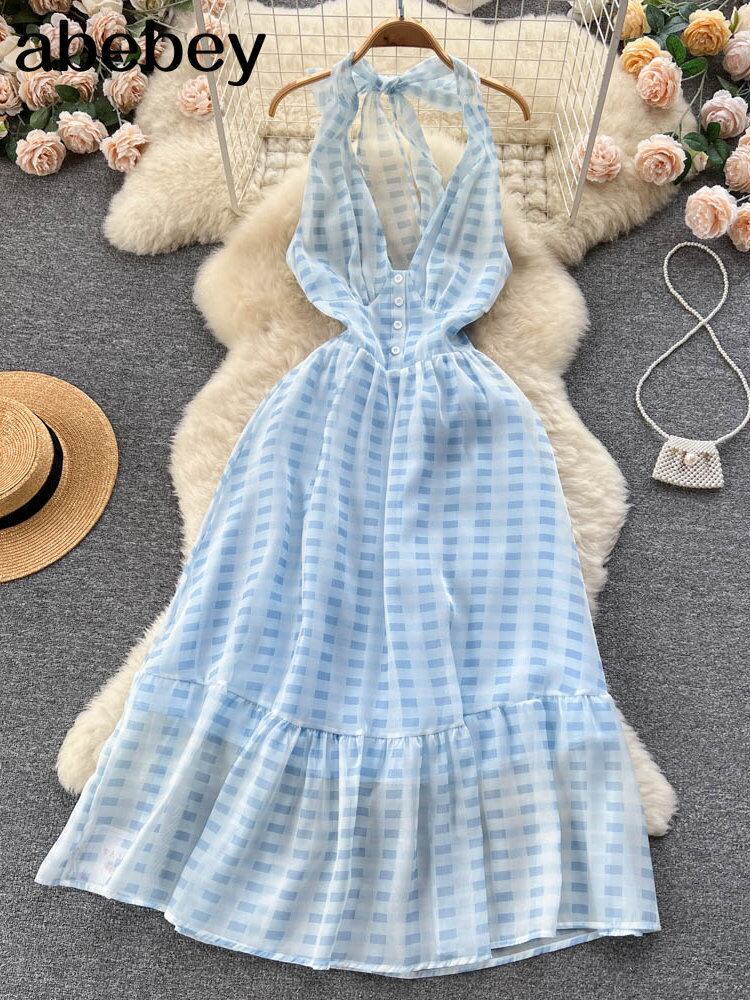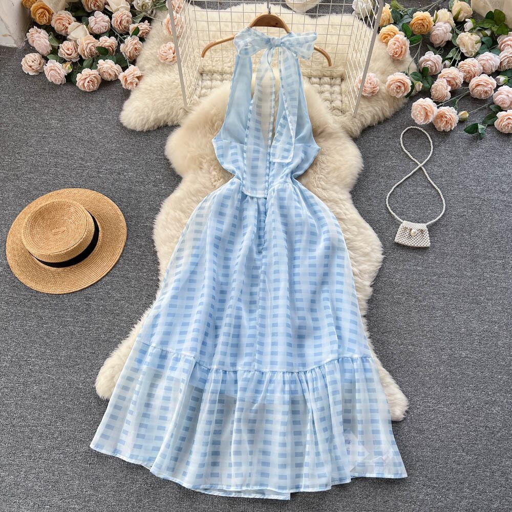 ノースリーブ ホルター サマー ドレスフレンチ スタイル レースアップ スリム サンドレス中空アウト プリント ロング ビーチ ドレス 夏物