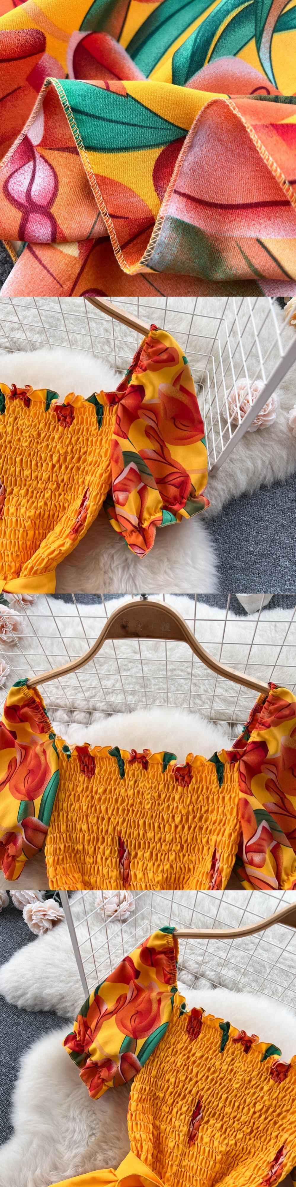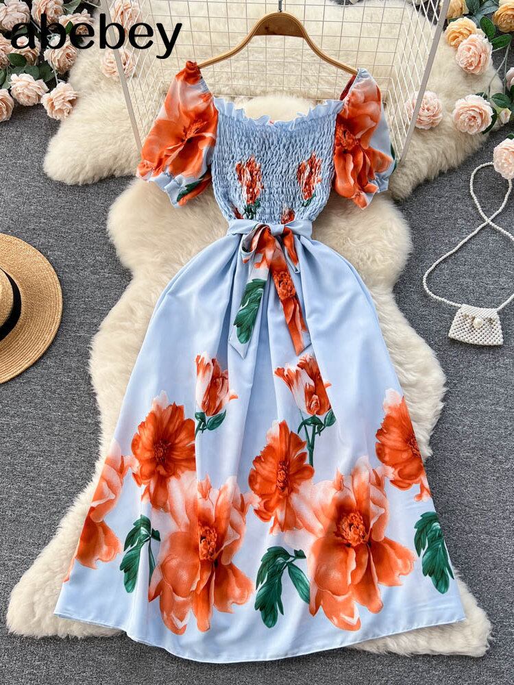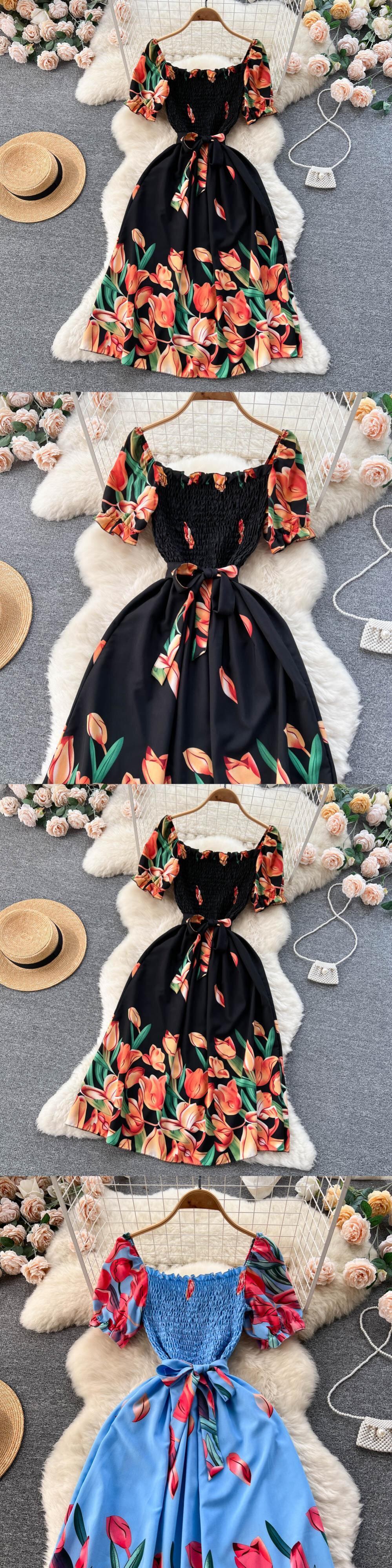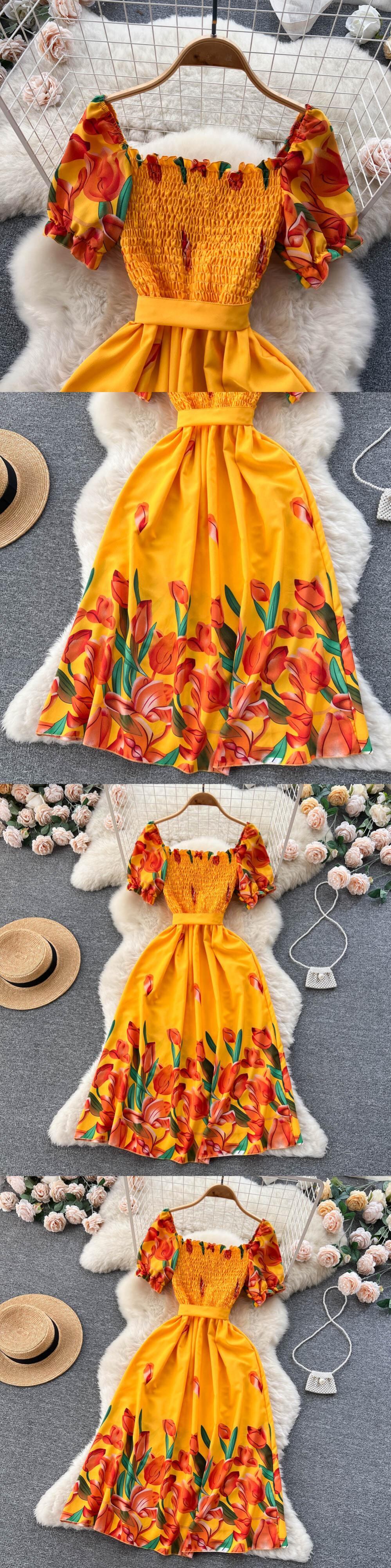夏スウィートプリントロングドレススクエアネック A ライン弾性サンドレスシャーリング花ビーチドレス エラスティック 伸縮 大人ガーリー キュート カジュアル サマー 夏物 花柄 Aライン