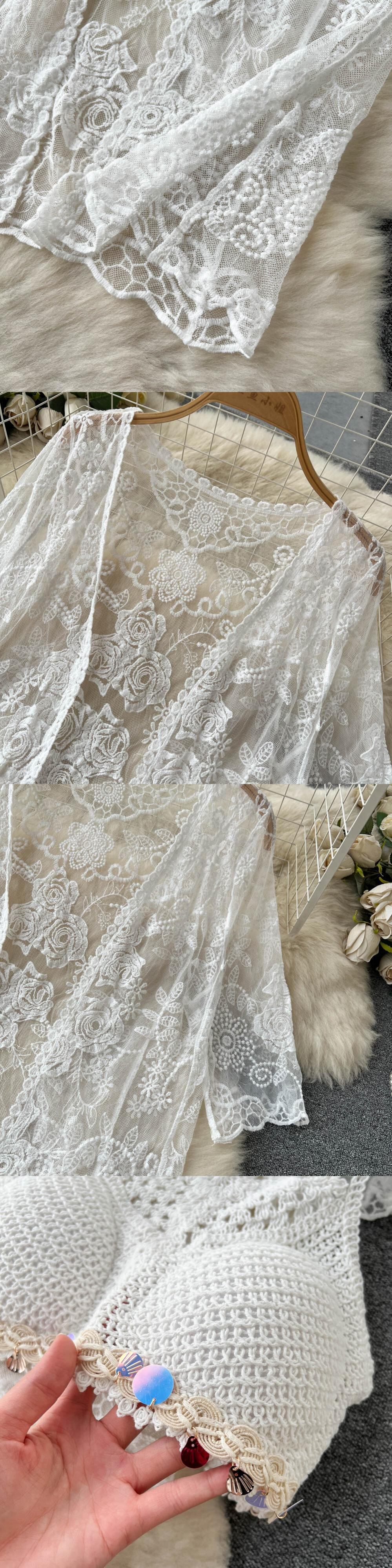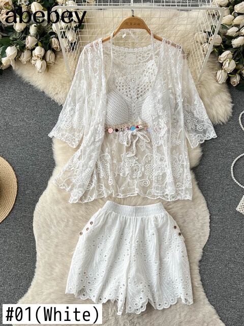 の夏のレースのスーツセクシーな背中の開いたストラップトップ + 半袖カーディガン + ウエストショートパンツ 3 点セット ハーフスリーブ サマー 夏物