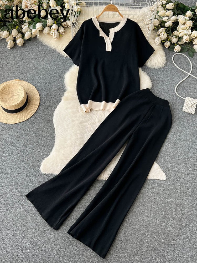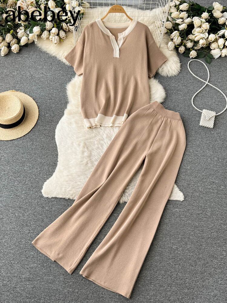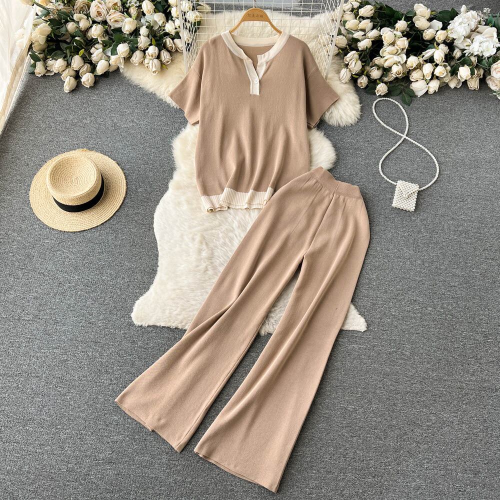 夏ニットのズボンスーツ 2 点セットブルールーズ半袖ニットワイドレッグパンツセットスーツ ショート ハーフスリーブ サマー 夏物 ワイドパンツ