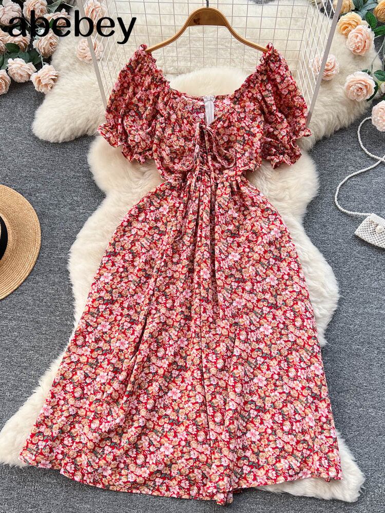 ドレス V ネック パフ スリーブ花柄弾性コルセット サマー ドレス パーティー Vestidos エラスティック 伸縮 夏物 Vネック