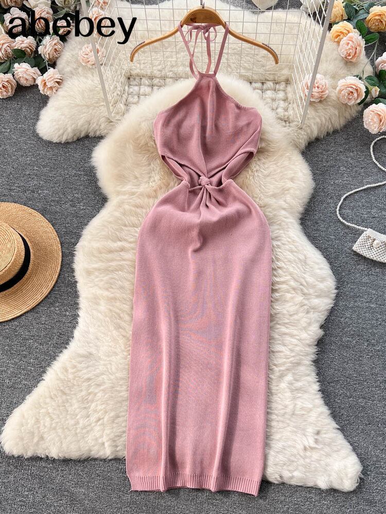 夏のホルターネックニットドレスsleevelssスプリットバックレスロングドレスストラップレス中空アウトセクシーなマキシドレス サマー 夏物