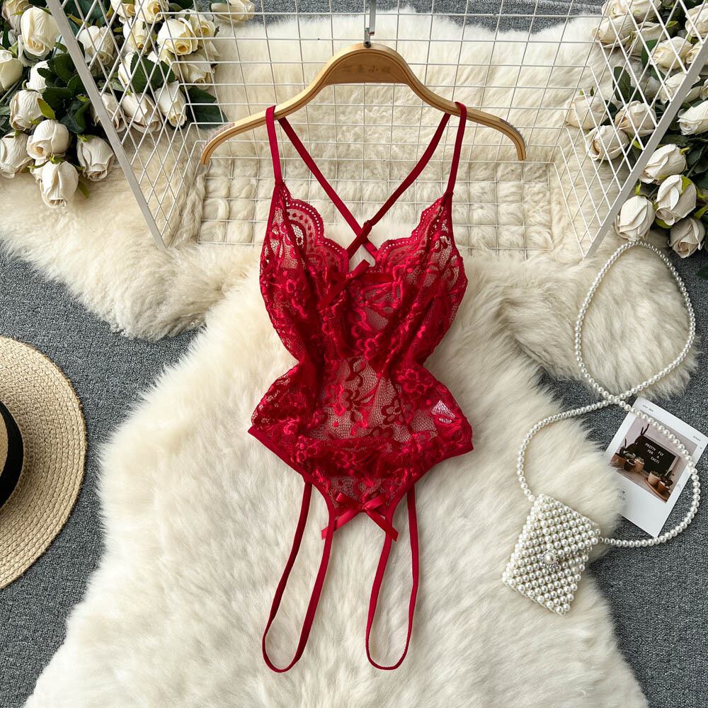 レースセクシーなキャミソールボディスーツ中空アウトオフショルダーバックレス夏インサイドウェア美容バック薄いジャンプスーツ サマー 夏物