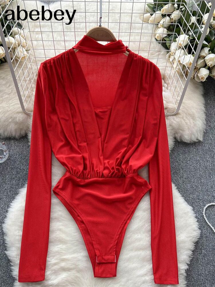 冬春セクシーなディープ V ネック グリーン ボディスーツ長袖ボディ トップス ロング スプリング 春物 ウィンター 冬物 Vネック ソリッドカラー